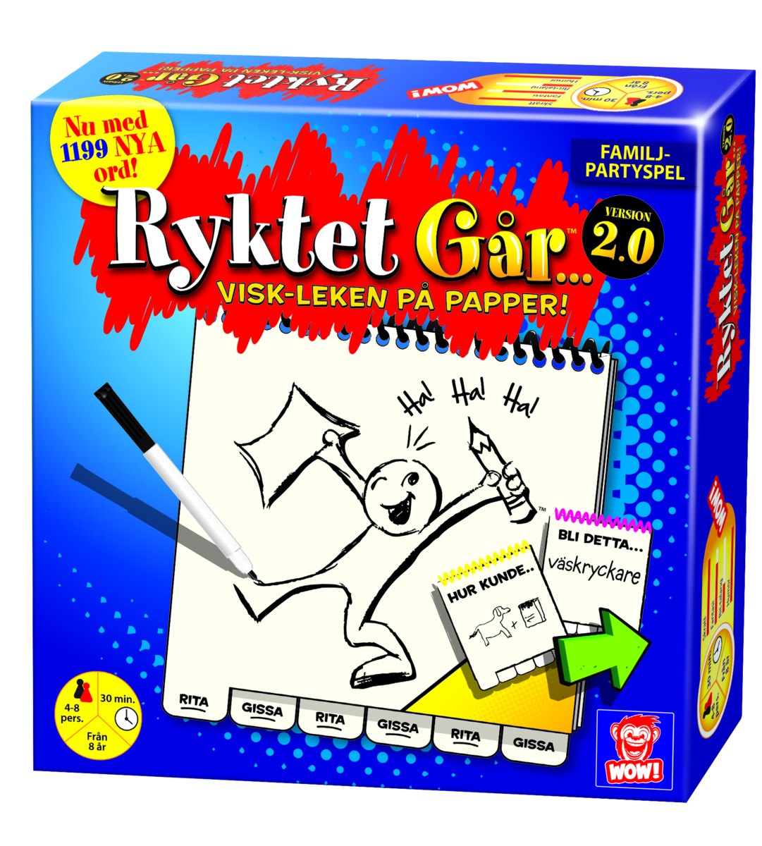 Ta varsitt block och ett kort med hemliga ord. Alla ritar sedan sitt hemliga ord. Skicka blocket vidare och gissa vad som ritats. Skriv det och skicka vidare. Rita - gissa - rita - gissa. För 4-8 spelare. Speltid ca 30 minuter. Av kartong, PP och PS. PVC-fri. Rekommenderas från 8 år.