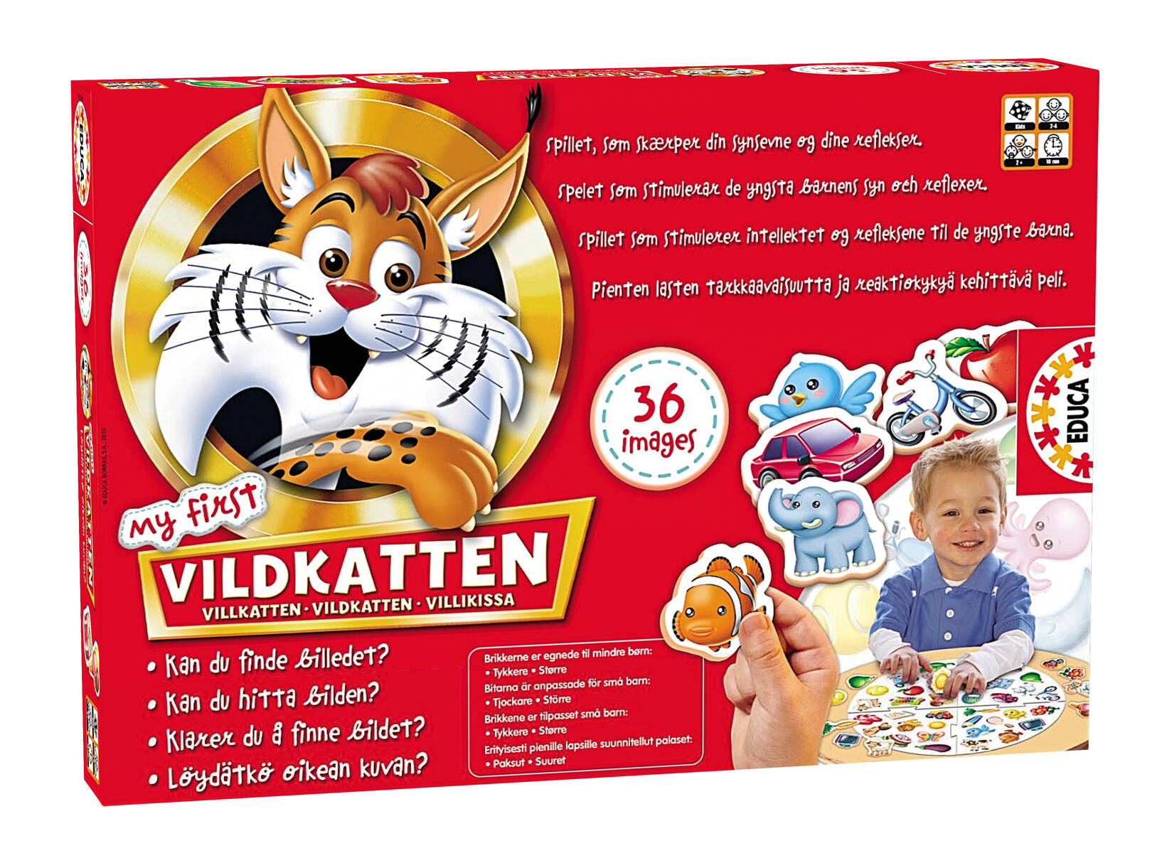 Vem hittar bilden på spelbrädet först? Vildkatten är ett roligt, enkelt och snabbt observationsspel som passar alla. Vänd på bildkorten och tävla om vem som hittar det matchande motivet på spelbrädet först. Nu med 500 bilder. För 1-6 spelare. Speltid ca 20 min. Av ingående FSC-märkt kartong. PVC-fri. Från 6 år.