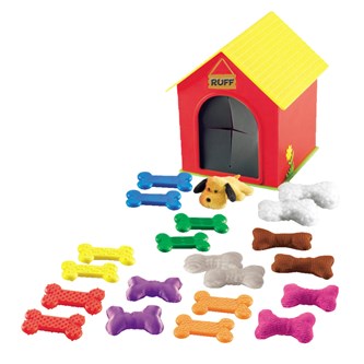 Hjälp Ruff att finna alla gömda hundben i sitt hus. Ett taktilt känselspel där hundbenen har olika struktur och barnen ska försöka finna matchande par genom att känna efter med handen i huset. Innehåller 20 stycken hundben, en hund och ett hus. Mått: hus 12x17 cm och hundben 5 cm. Av ABS och TPE. PVC-fri. Från 3 år.