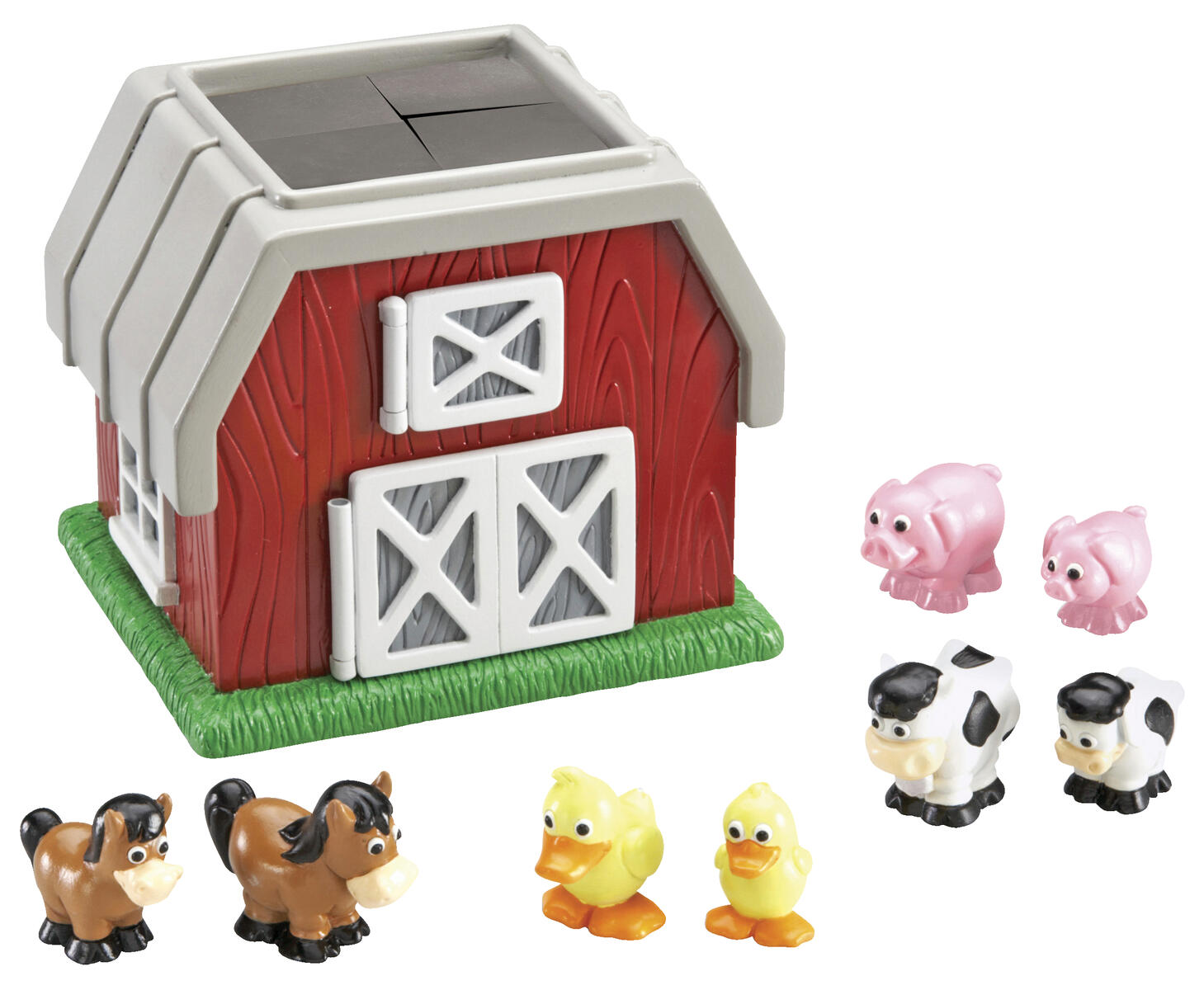 Låt barnen sticka ner handen och känna efter vad som gömmer sig i ladugården – se om de kan hitta de matchande djuren! Innehåller ko och kalv, sugga och kulting, anka och ankunge samt sto och föl. Tränar t.ex. begreppen stor och liten samt det taktila sinnet. Mått på ladugård: 17x15 cm. PVC-fri. Från 2 år.