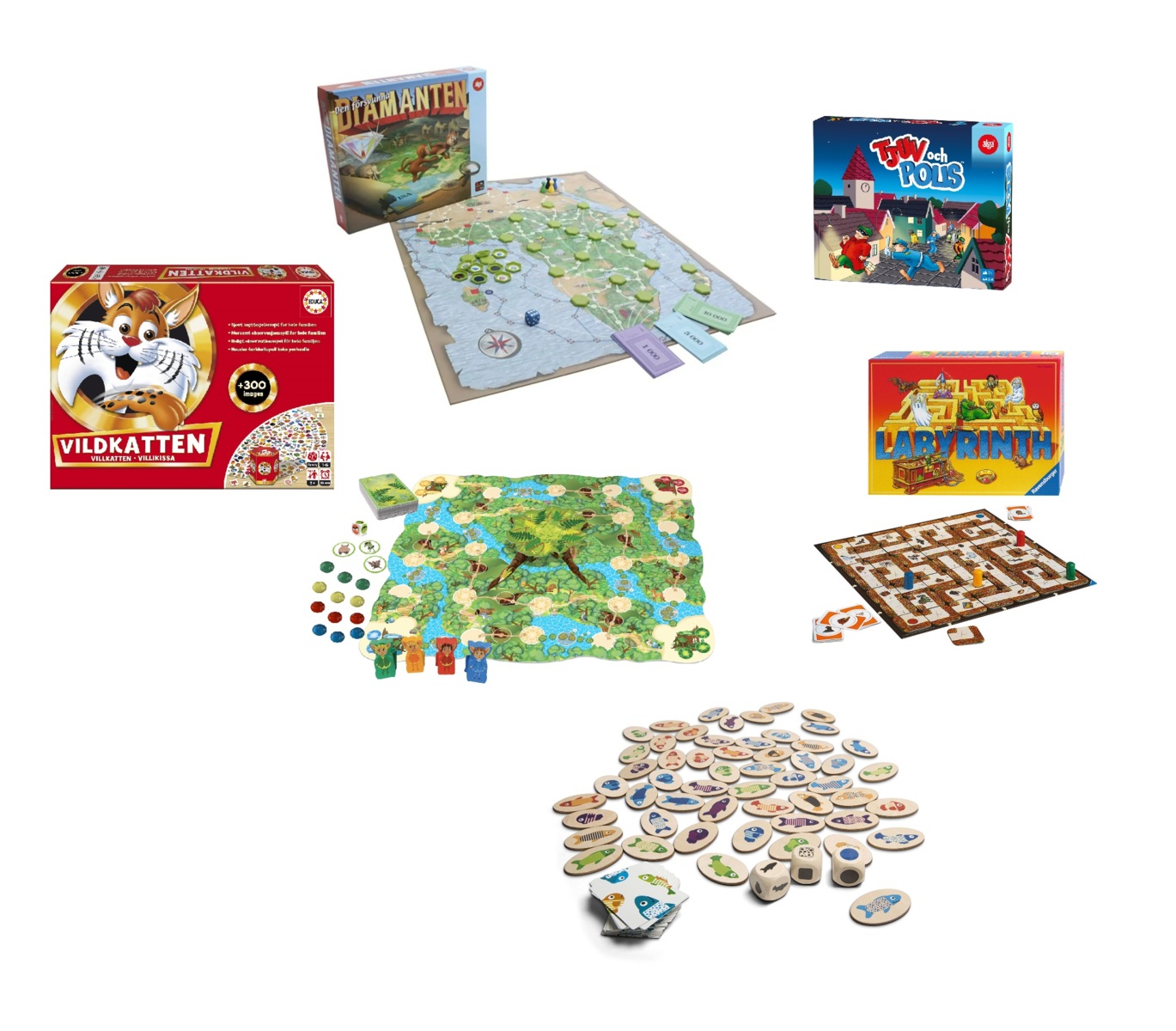 6 st/fp. Spännande och lärorika spel. Innehåller Vildkatten 16905, Hitta fisken 137688, Labyrinth 16315, Den magiska skogen 143217, Tjuv och polis 130957, Den försvunna diamanten 16814. PVC-fri. Rekommenderas från 4 till 8 år.