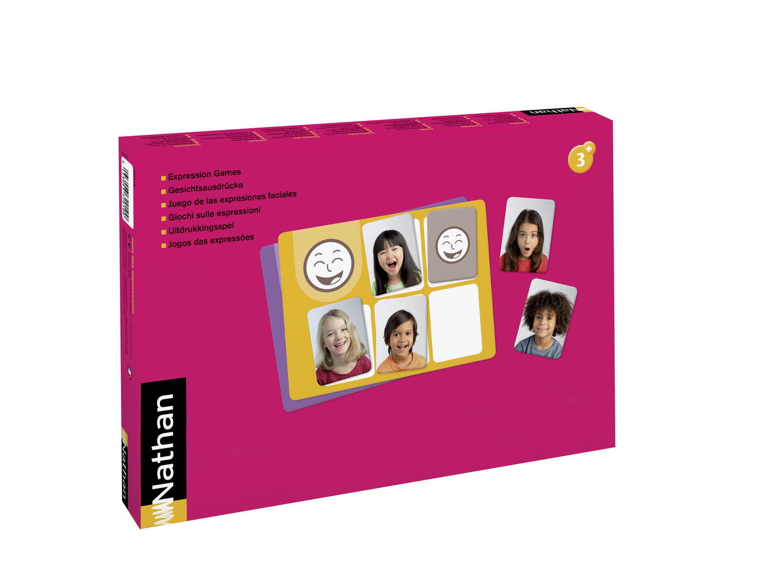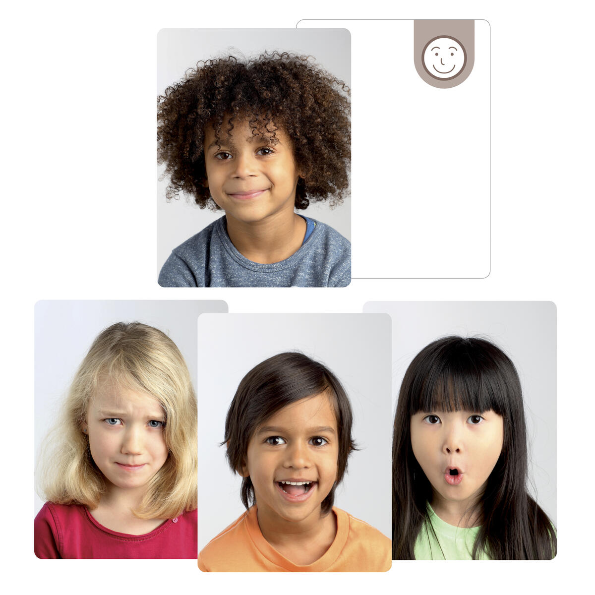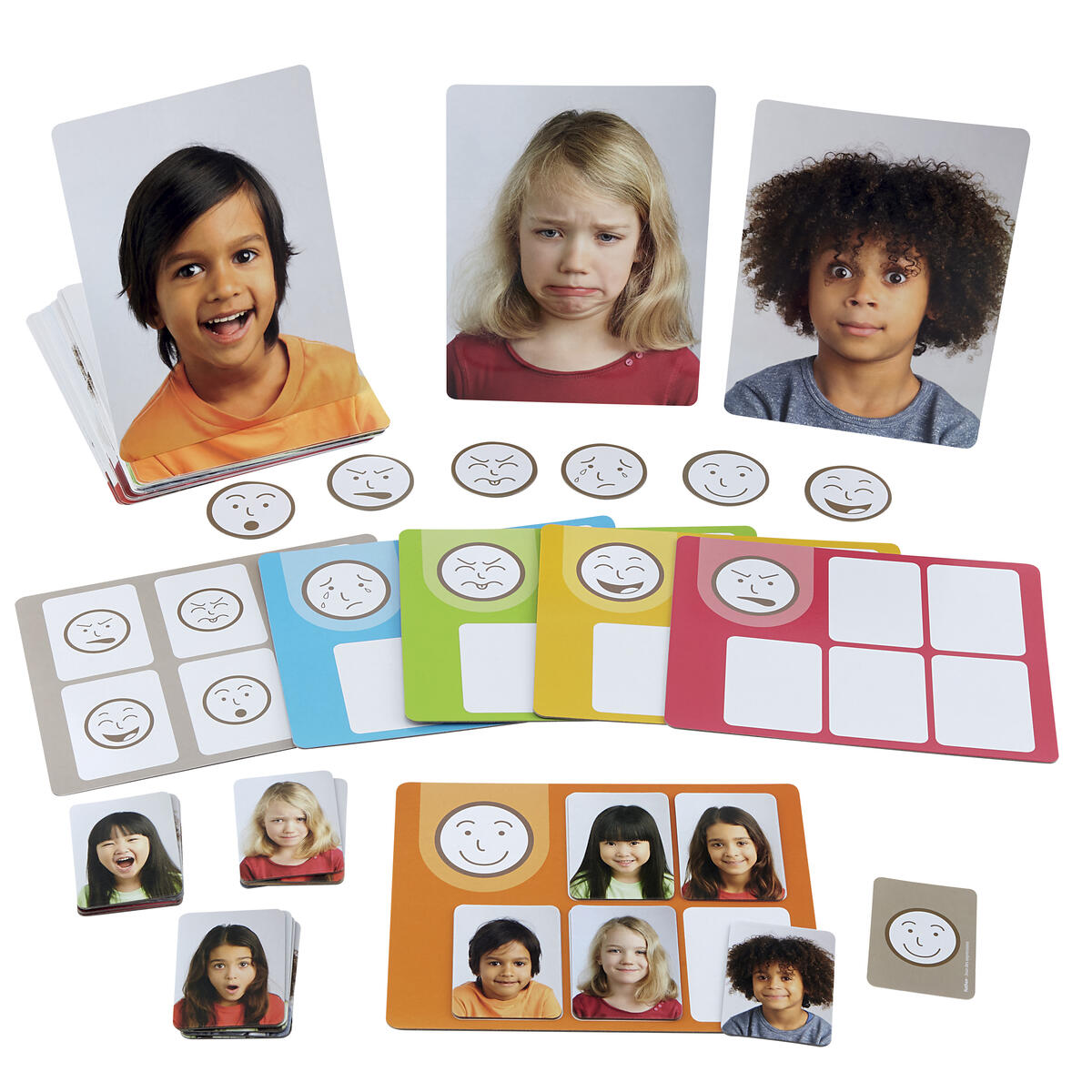 4 spel i ett! Barnen lär sig att känna igen, namnge, beskriva, tolka och återge 6 ansiktsuttryck: leende, skratt, sorg, ilska, avsky och förvåning. De förbättrar sitt ordförråd och utvecklar en medvetenhet om att deras ansikten är avgörande för att uttrycka sig, och för ickeverbal kommunikation. Ett språkspel där man kan förklara, jämföra m.m., ett sorteringsspel där man sorterar känslorna samt två lottospel. PVC-fri. Från 3 år.
