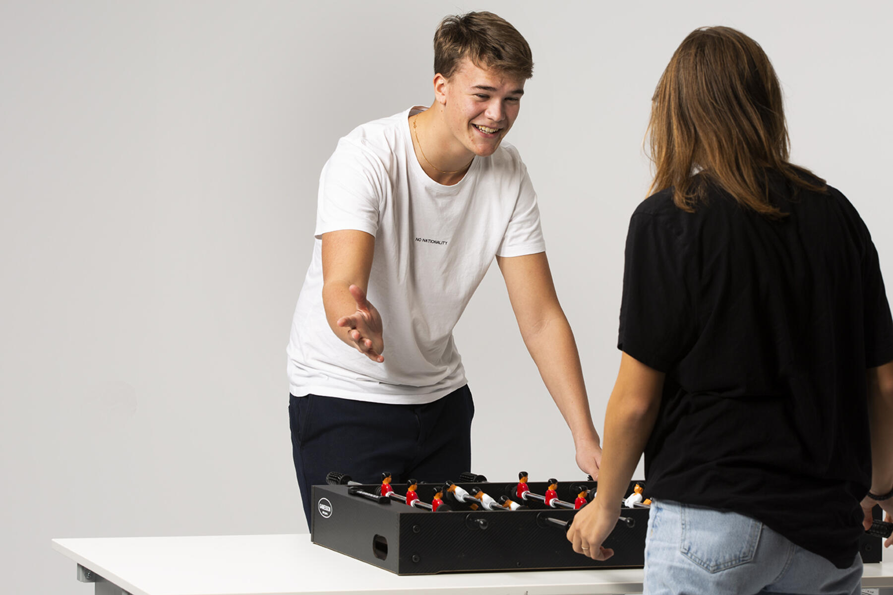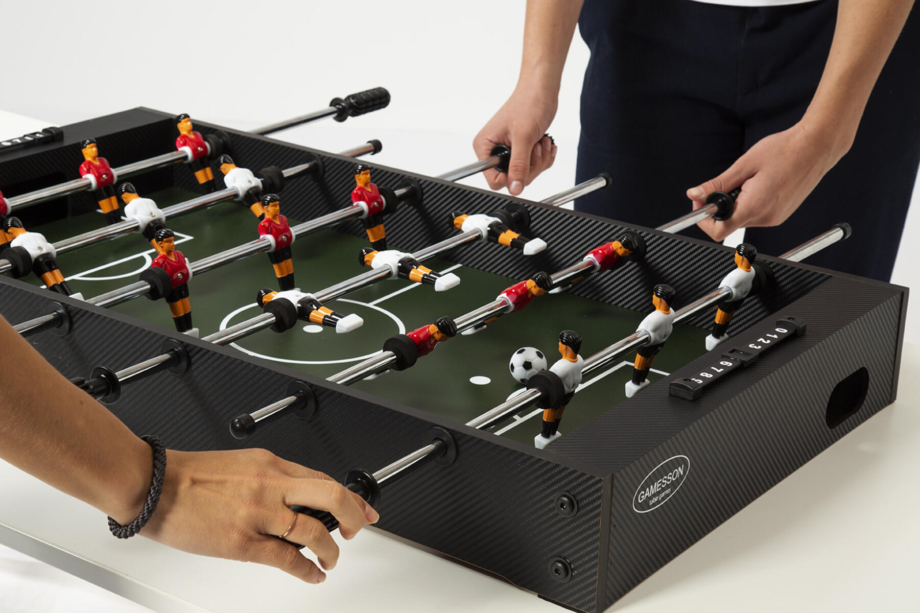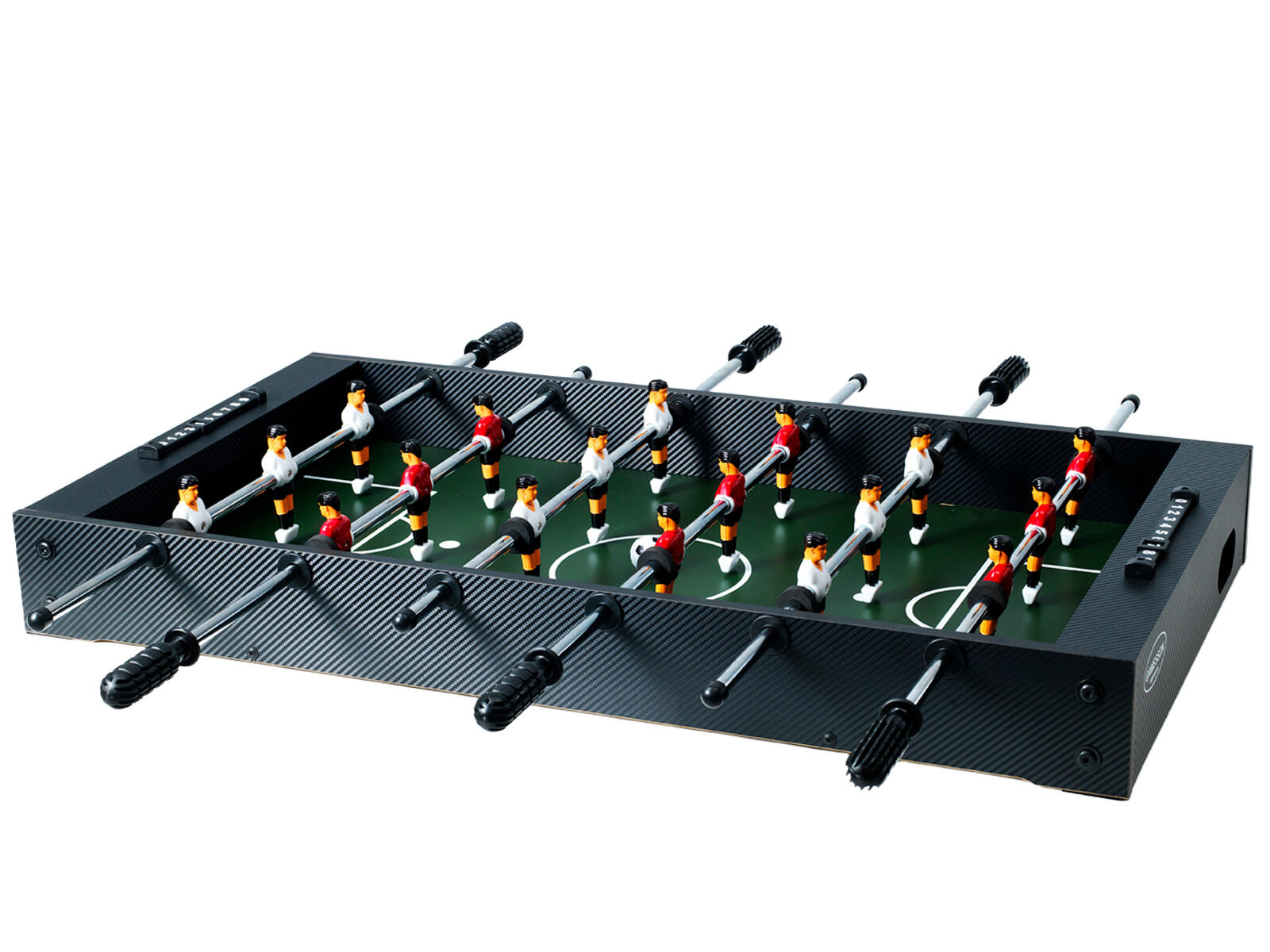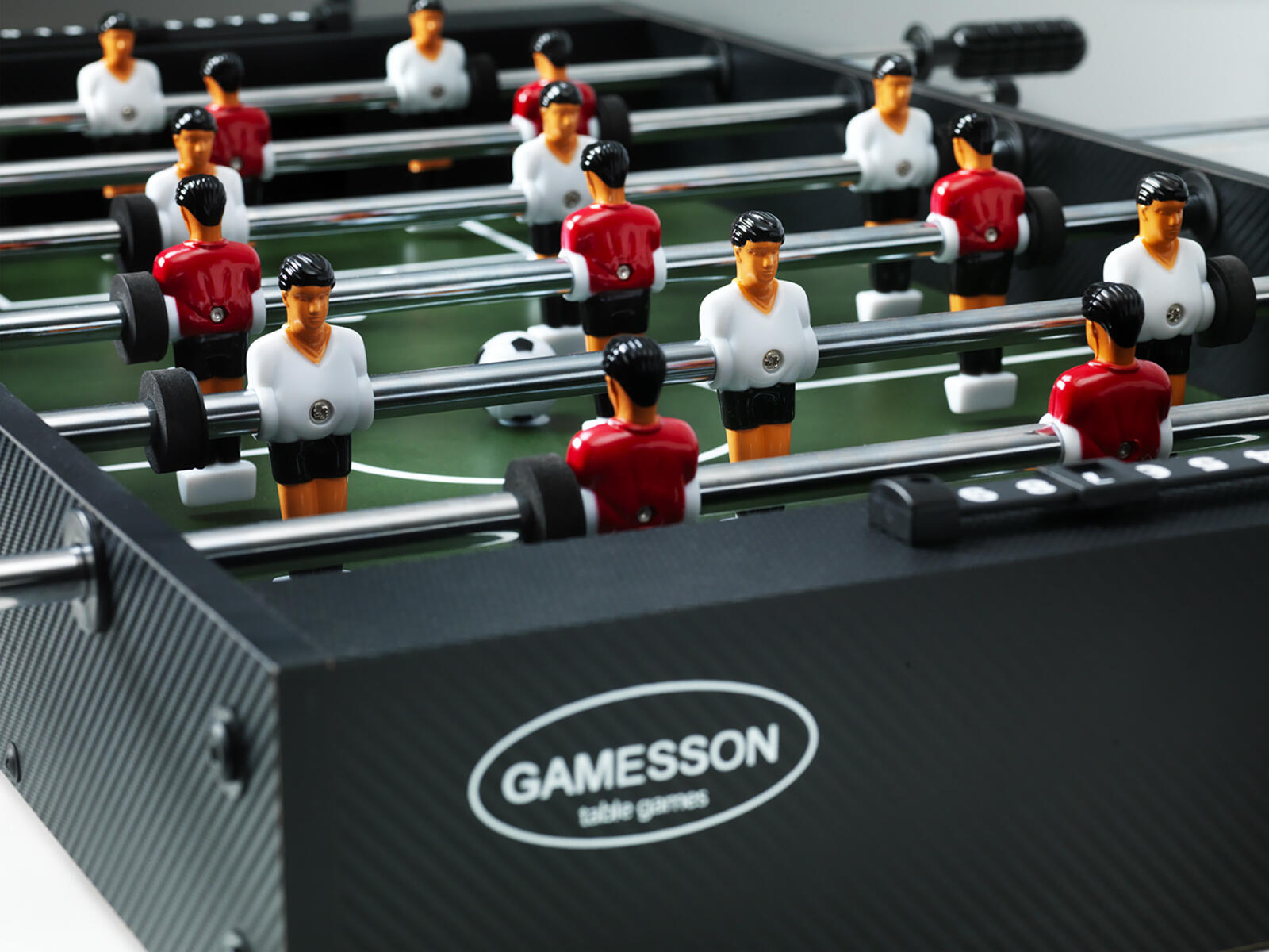 Ett fotbollsspel som nu har en förbättrad konstruktion med extra starka teleskopstänger som inte sticker ut på motsatta sidan och med spelare som är formade för bästa bollkontroll. Fotbollsspelet är av laminat och har stabila höj- och sänkbara ben av metall som går att skruva av vid behov. Spelplanen är vinklad i hörnen så att bollen aldrig stannar. 2 bollar medföljer. Levereras omonterat. Mått: 136x76x91 cm. Vikt 70 kg. PVC-fri.