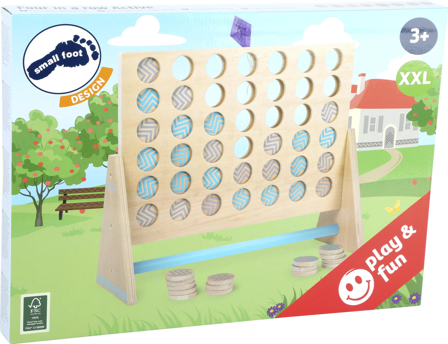 Ett klassiskt spel i fin kvalitet och stort format. Kan användas ute men bör tas in nattetid och vid regn. Spelet går ut på att få 4 av sina marker i rad först, antingen lodrätt, vertikalt eller diagonalt. När spelet är slut tömmer man enkelt ut markerna och börjar om igen. Förvaringspåse ingår. Mått: H48xB60 cm. Av FSC-märkt trä. PVC-fri. Från 6 år.