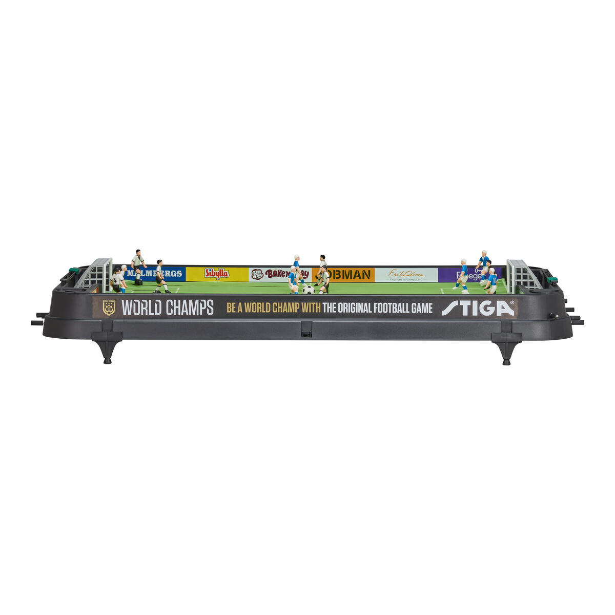 Ett klassiskt fotbollsspel från Stiga. Utmana dina vänner och vinn VM! Neutralt spelande lag i blått och vitt. För 2 spelare. Mått: 94x50 cm. PVC-fri. Från 3 år.