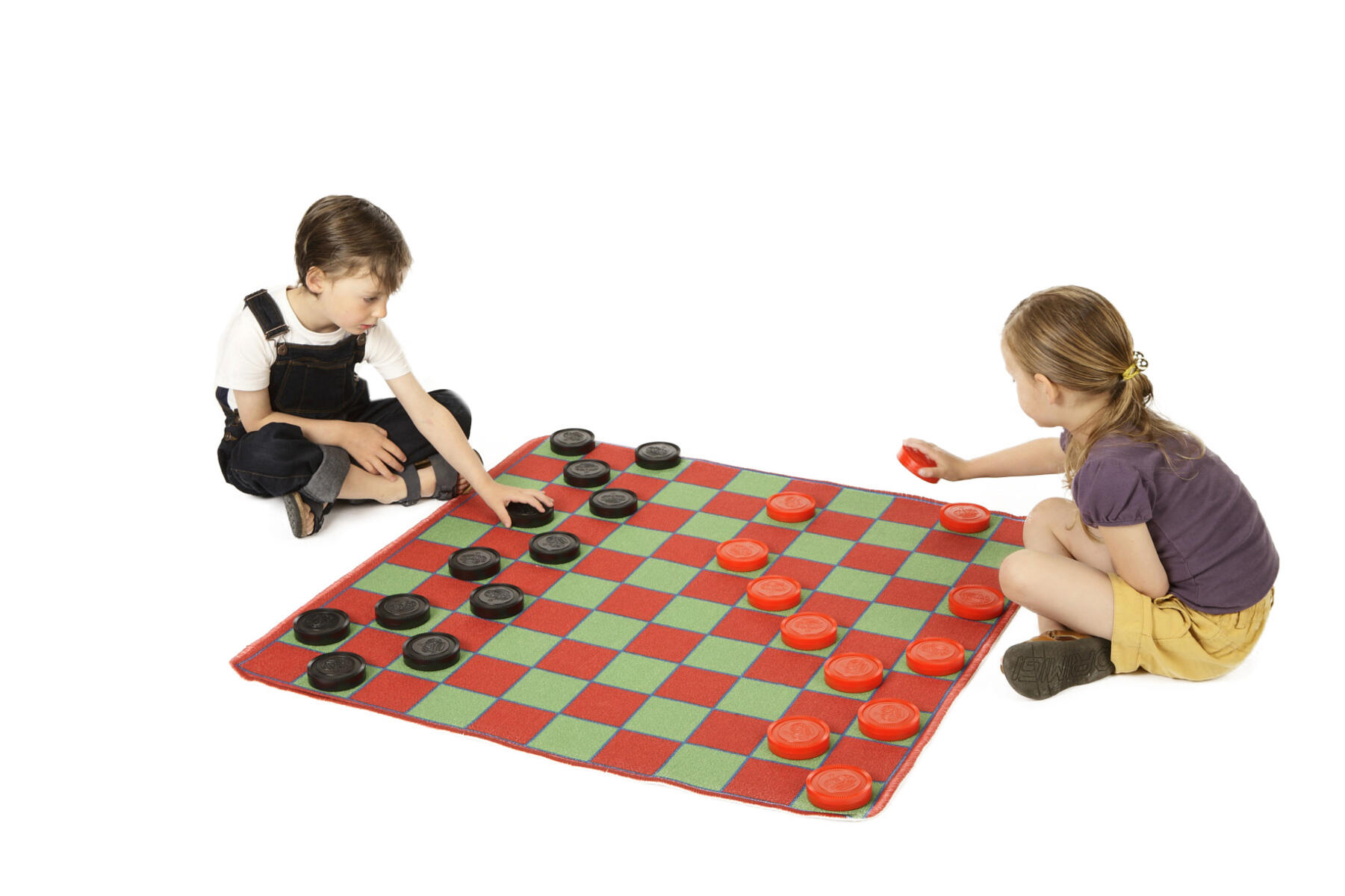 Ett klassiskt strategispel i stort format som går ut på att utmanövrera motspelarens brickor. Spelet spelas genom att man flyttar spelbrickor diagonalt framåt på rutorna ett steg i taget, eller genom att hoppa diagonalt över en motståndarbricka om det finns en tom ruta bakom. Vinner gör den spelare som har flest brickor på spelbordet. 2x20 spelpjäser ingår. Matta av polyamid med gummerad undersida av latex. PVC-fri. Från 3 år.