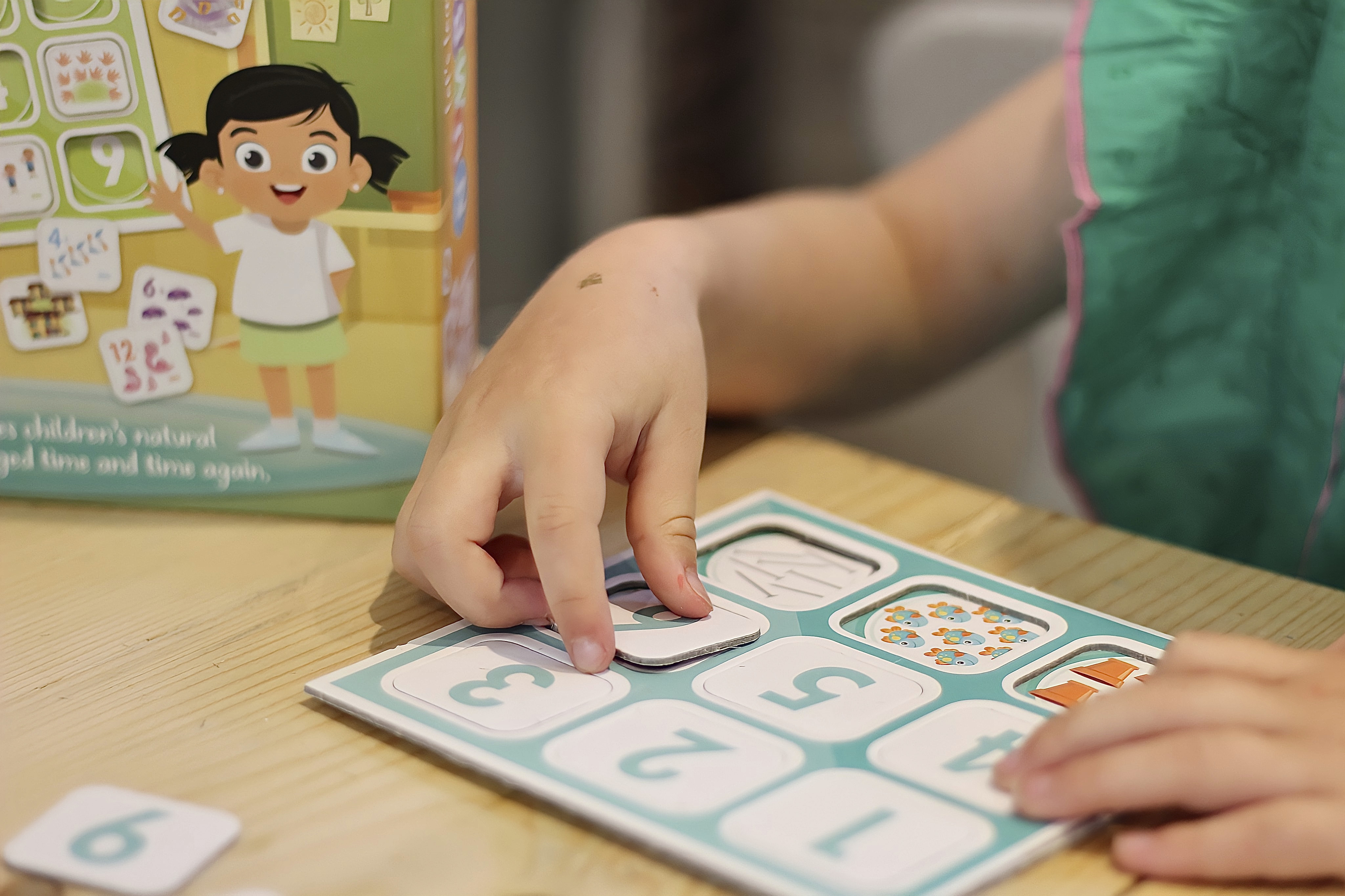 Ett roligt och enkelt spel för barn som vill lära sig siffror och räkning. Lös enkla tal genom att lägga brickorna på spelplanen. Om du har räknat rätt så får du en fin bild på spelplanens baksida. Spelet innehåller 8 spelplaner och 72 olika uppgifter. Av FSC-märkt kartong och papper. PVC-fri. Från 4 år.