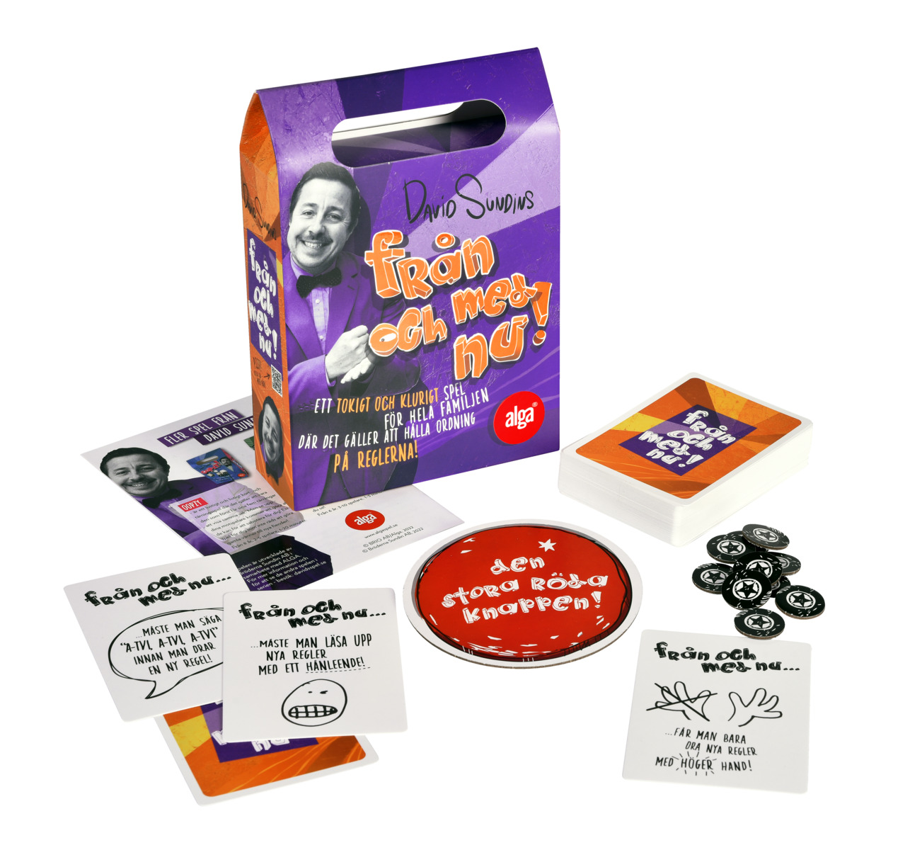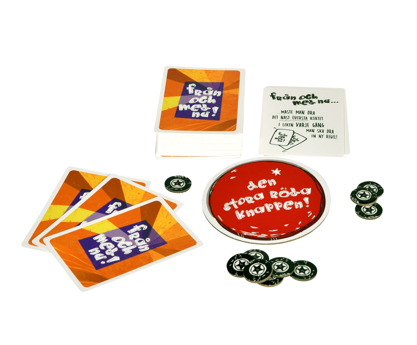 Spelet startar utan regler men fylls snabbt på med galna instruktioner. Var alert och tryck på den stora röda knappen så fort någon annan bryter mot en av reglerna. För 2-8 spelare. Speltid ca 10-20 minuter. Rekommenderad från 9 år. PVC-fri.