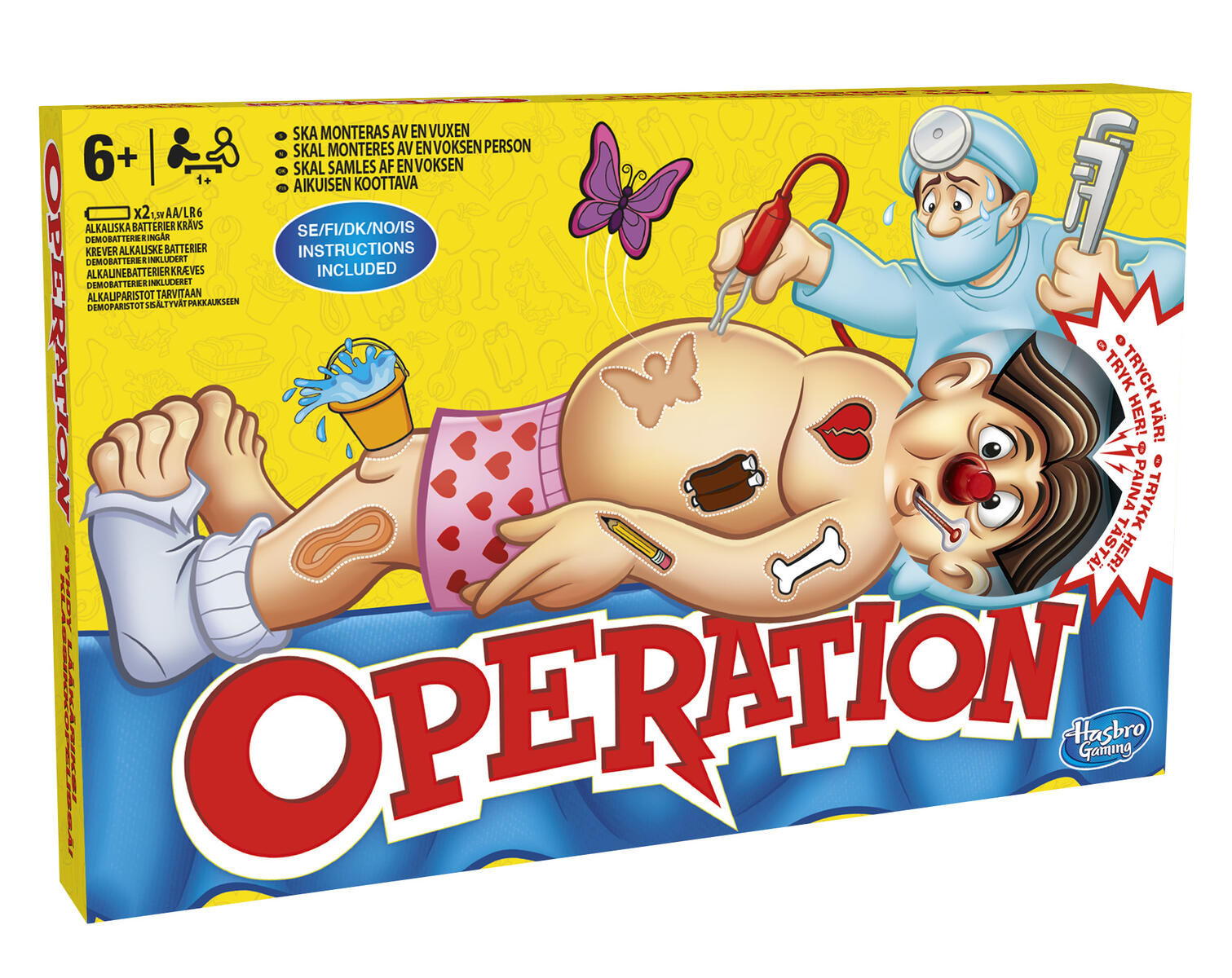 Ett spel som utmanar alla sinnen. Välj ett kort och utför sedan operationen genom att ta bort patientens krämpa. Med nya sjukdomar som sms-tumme och digital integrering. Du belönas med pengar om du klarar uppdraget och inte utlöser det surrande ljudet. 2 st AA-batterier krävs, ingår ej. Från 6 år.