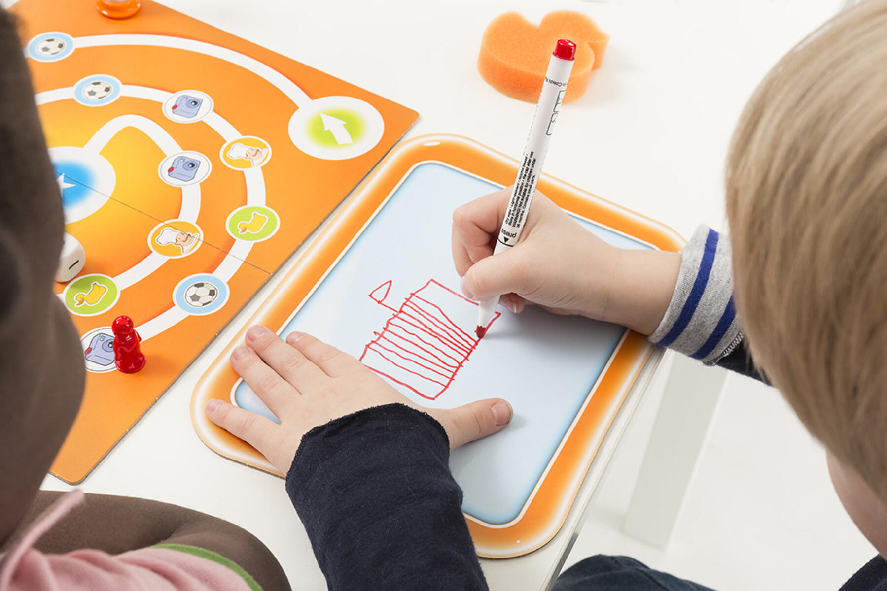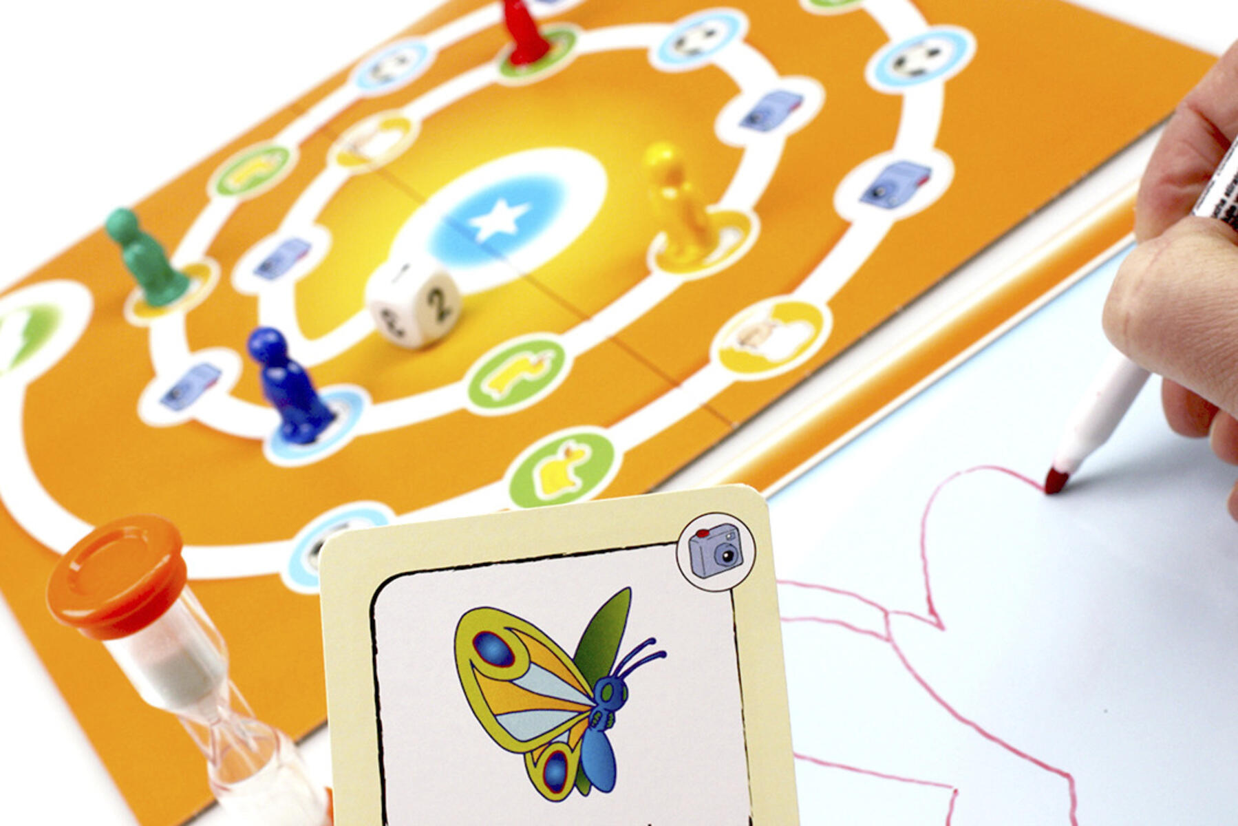 På varje kort finns ett illustrerat ord för yngre barn och tre skrivna ord för de lite äldre i kategorierna: Saker, Djur & Natur samt Personer & Figurer. Turas om att rita ledtrådar medan de andra spelarna gissar vad som ritas. Barn som ännu inte lärt sig läsa ritar bara de illustrerade orden. Om någon gissar rätt får både den som ritar och den som gissar rätt flytta framåt på spelplanen. Den som först kommer i mål har vunnit. För 3-6 spelare. Speltid ca 30 minuter. Av FSC-märkt kartong. PVC-fri. Rekommenderad från 5 år.