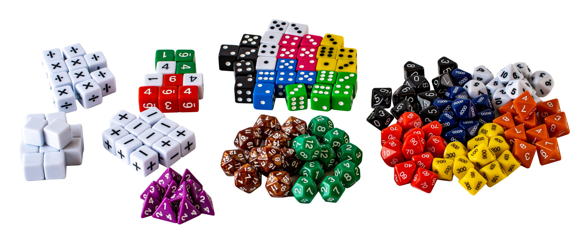 162 st/fp. Ett stort tärningsset som kan hålla alla sysselsatta. Innehåller: 30 pricktärningar, 10 siffertärningar, 12 blanka tärningar, 20 tärningar med matematiska symboler och 90 olika polyhedraltärningar. Av plast. Tärningar av ABS och väska av polypropenplast. Från 6 år.