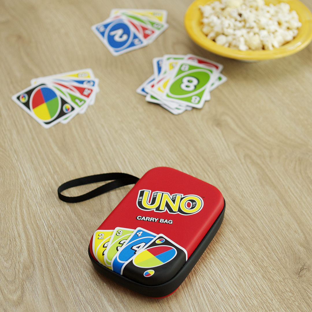 Praktisk väska för UNO-kort med innerficka för regelhäftet och två fack med gummiband för korten. Väskan är vattentät och lätt. Kort ingår inte. Mått: 11x3,5x15,5 cm. Av EVA, PU och nylon. PVC-fri.