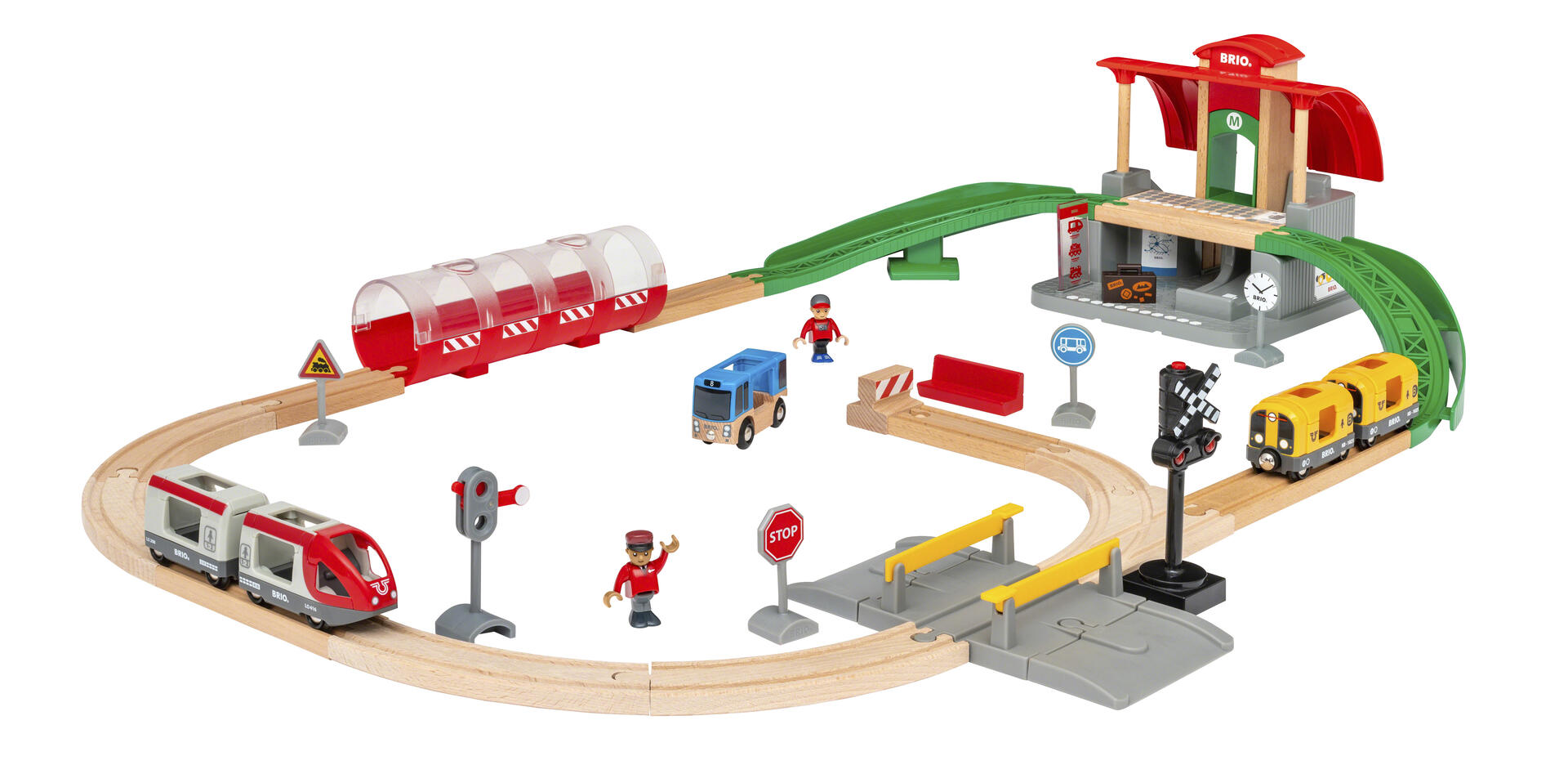 Detta set ger massor av järnvägslek i ett köp. Ta en tur med de 2 moderna tågen förbi stationer, lastbryggor och över broar. Utforska transportstrukturen med båt, buss och lastbil med två släp som kan köras på järnvägen. Levereras i förvaringsbox med lock som även kan vecklas ut till lekmatta. Av FSC-märkt bokträ och vattenbaserad färg. PVC-fri.Från 3 år.