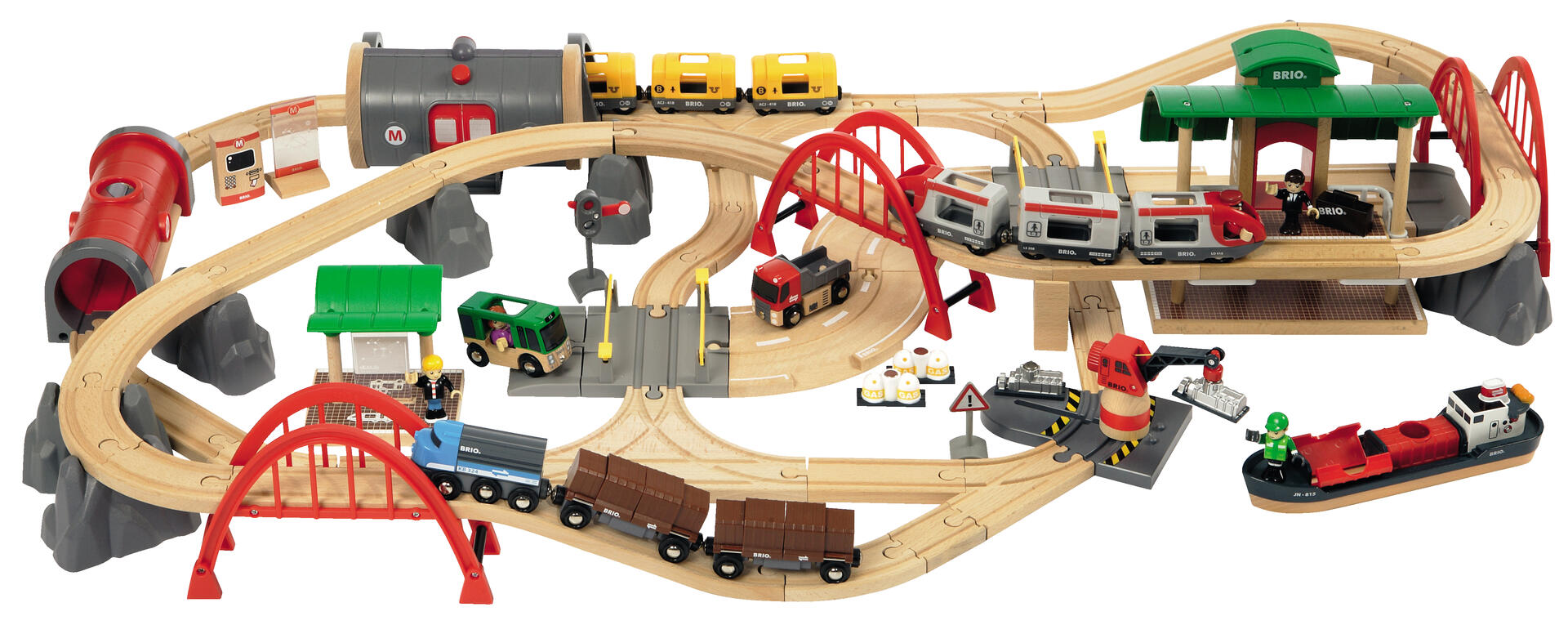 Detta set ger massor av järnvägslek i ett köp. Ta en tur med de 2 moderna tågen förbi stationer, lastbryggor och över broar. Utforska transportstrukturen med båt, buss och lastbil med två släp som kan köras på järnvägen. Levereras i förvaringsbox med lock som även kan vecklas ut till lekmatta. Av FSC-märkt bokträ och vattenbaserad färg. PVC-fri.Från 3 år.