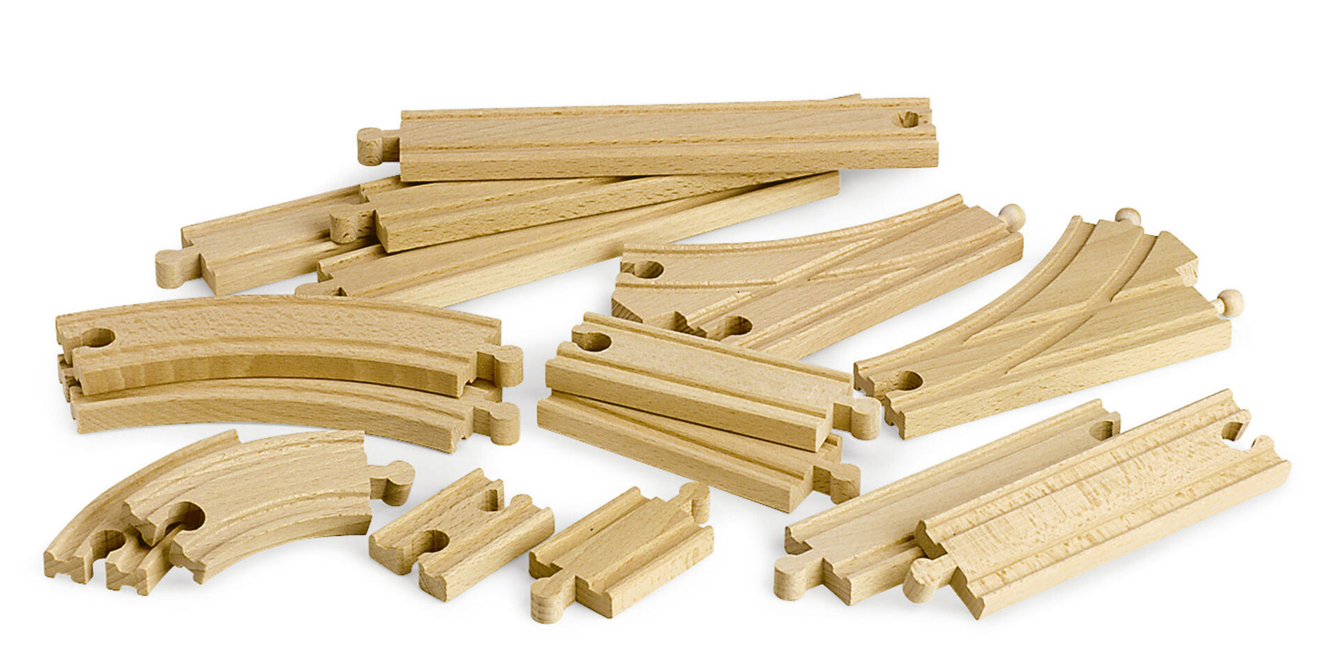Komplett järnvägsset bestående av 50 delar. Kan även användas som ett bra kompletteringsset till tågbana. Innehåller 36 skenor, 4 tåg och 10 olika tillbehör till järnvägsleken. Av FSC-märkt trä. Passar med andra fabrikat. PVC-fri. Från 3 år.