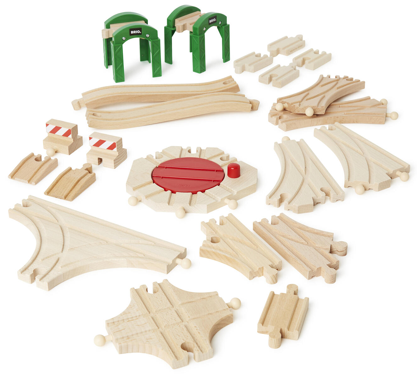 44 delar. Byggklossar för att kombinera plastklossar och trätågbanor. Barnens kreativitet utmanas genom att bygga på höjden. Ger en plan och stabil tågbana, även om bygget är avancerat. Innehåller 44 järnvägskopplingar. 28 baskontakter, 4 ankarkontakter, 6 dubbla flikar, 4 dubbla kopplingar och 2 korsningar. Byggklossar och träskenor medföljer inte. Av PLA-plast. Handtvättas. PVC-fri. Från 3 år.