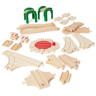 100 st/fp. En stor tågbana med många skenor för ett stort järnvägsbygge. Kommer med tillbehör som lok, vagnar, skyltar och väntande resenärer. Av FSC-märkt trä. Passar med andra fabrikat. PVC-fri. Från 3 år.