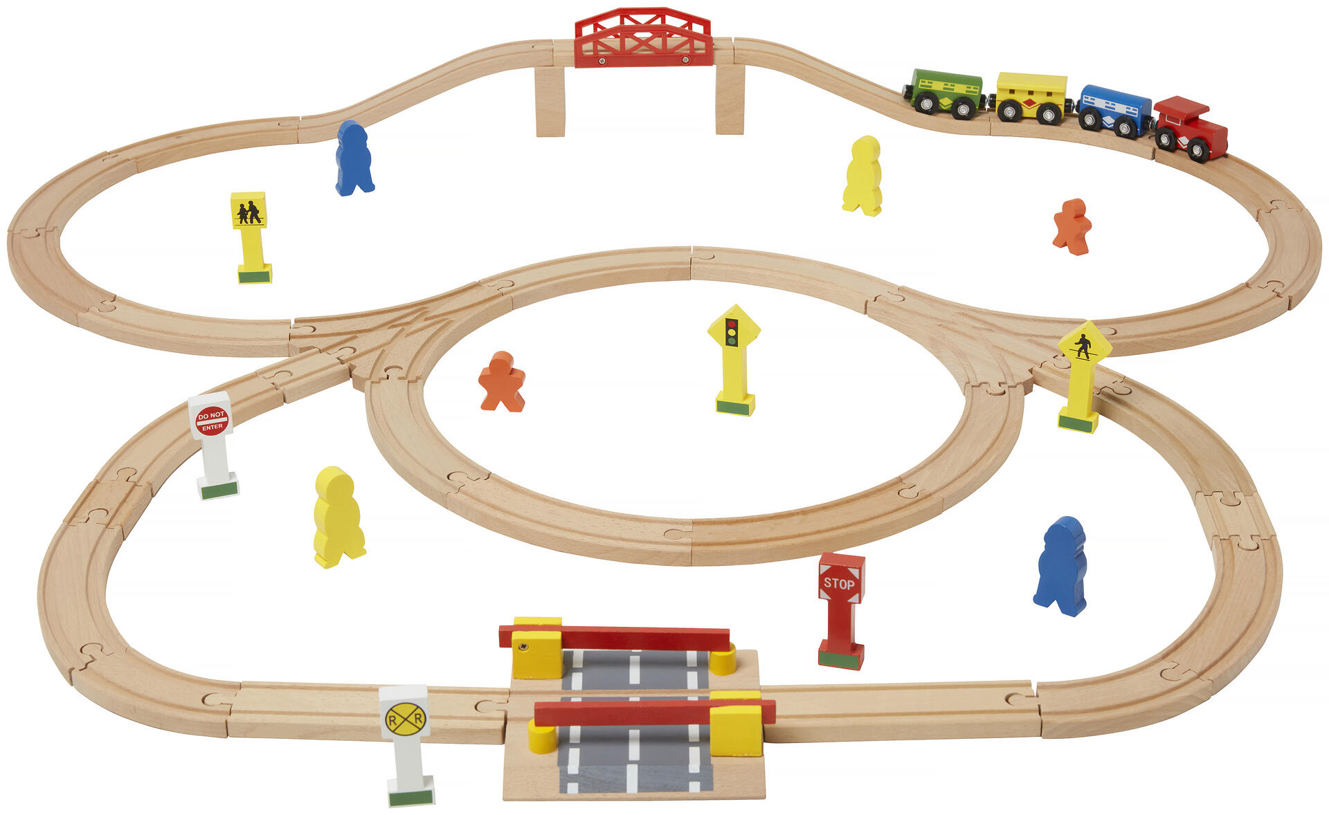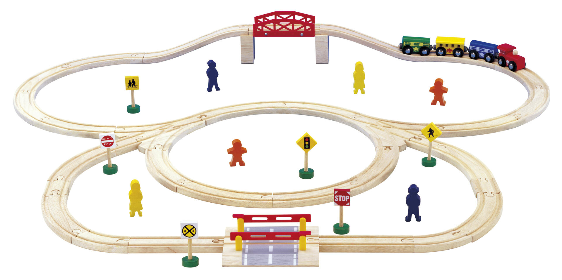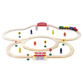Komplett järnvägsset bestående av 50 delar. Kan även användas som ett bra kompletteringsset till tågbana. Innehåller 36 skenor, 4 tåg och 10 olika tillbehör till järnvägsleken. Av FSC-märkt trä. Passar med andra fabrikat. PVC-fri. Från 3 år.
