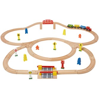 100 st/fp. En stor tågbana med många skenor för ett stort järnvägsbygge. Kommer med tillbehör som lok, vagnar, skyltar och väntande resenärer. Av FSC-märkt trä. Passar med andra fabrikat. PVC-fri. Från 3 år.