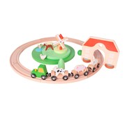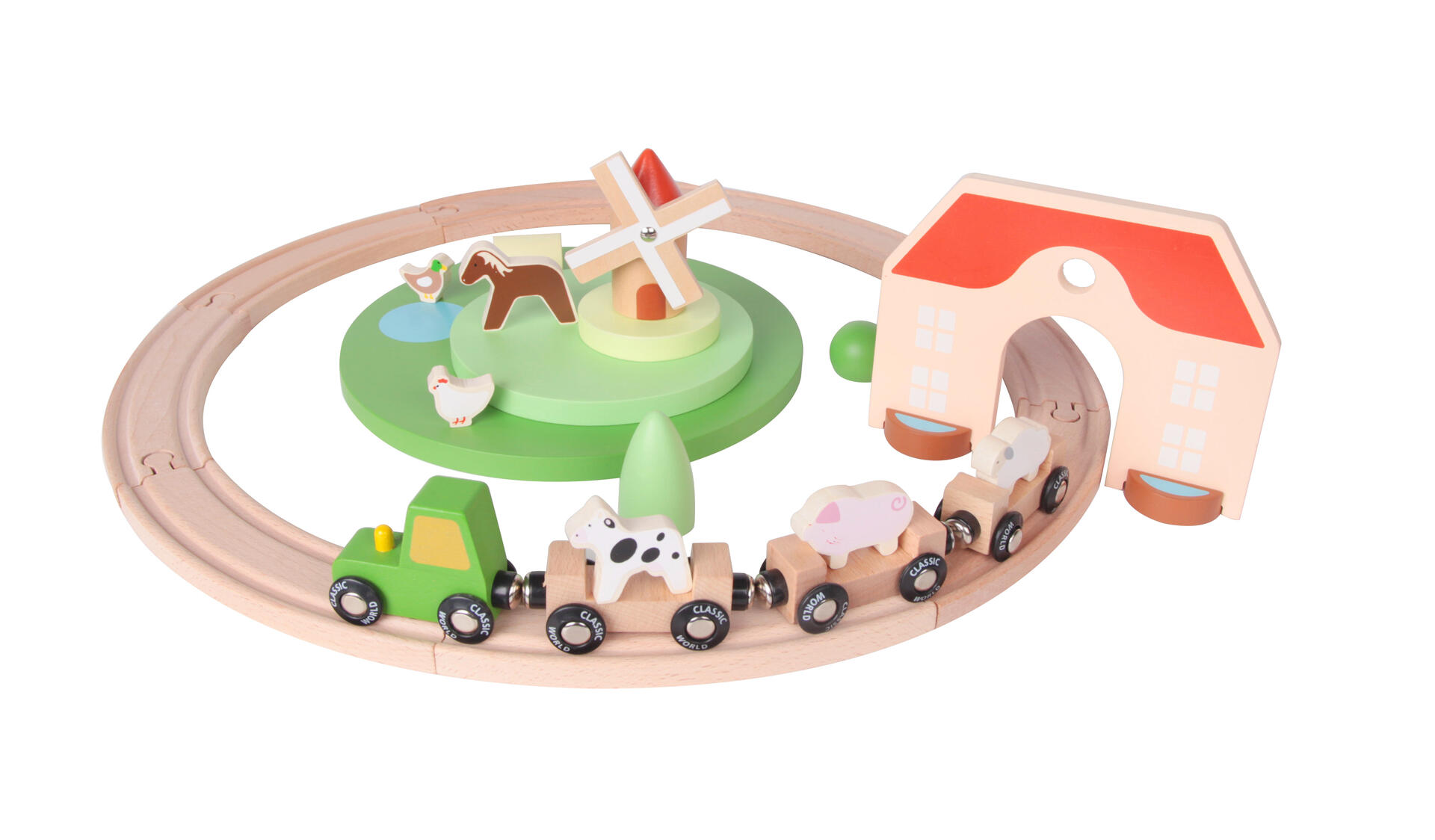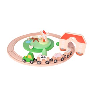 Innehåller skenor, tåg med vagnar samt bondgårdstillbehör. Förvaringspåse medföljer. Produkten är målad med vattenbaserad färg och fri från giftiga kemikalier. PVC-fri. Från 3 år.