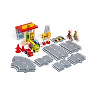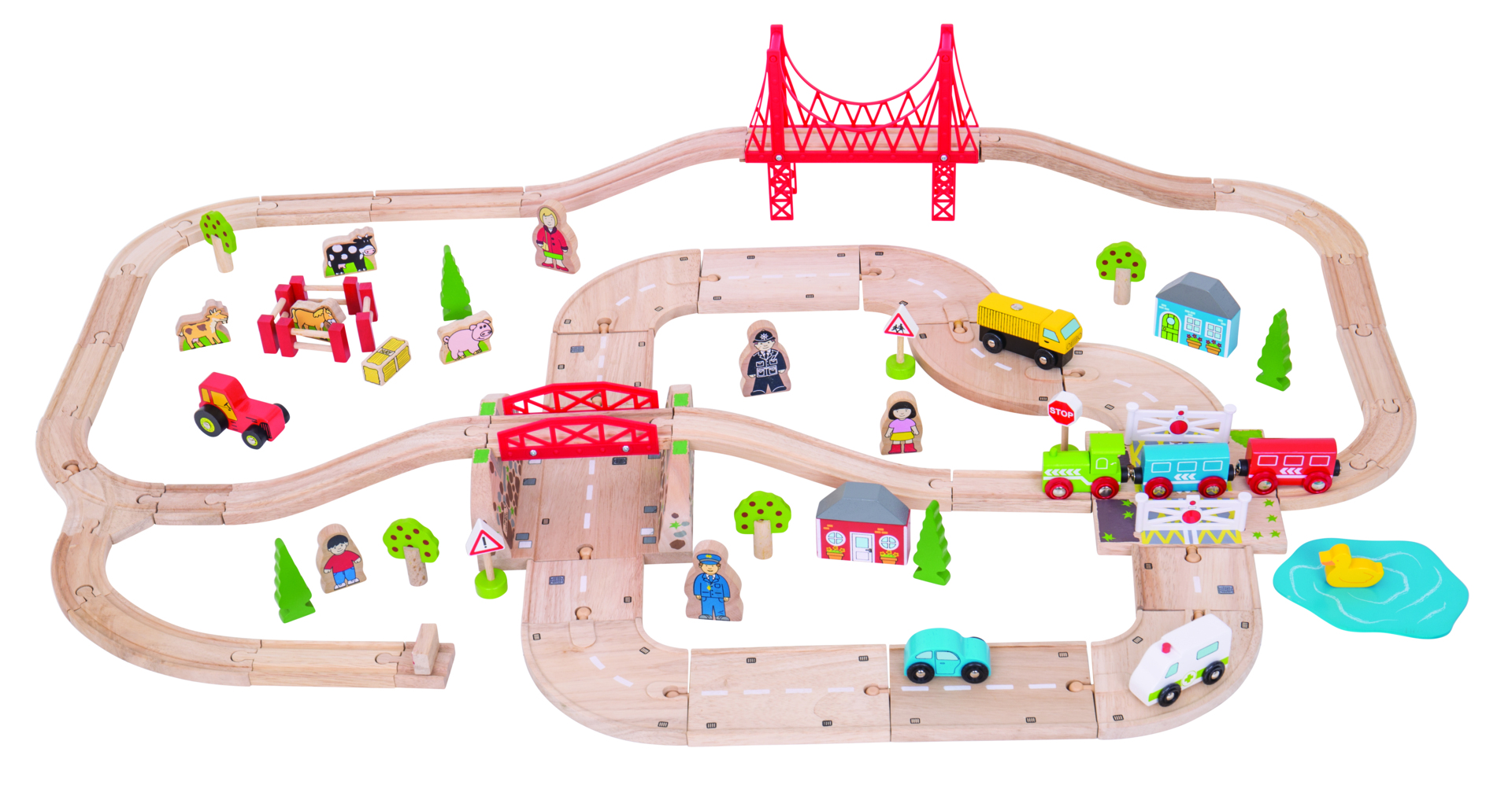 80 delar. Set som kombinerar tåg- och vägbana i ett spännande leklandskap. Innehåller bondgårdsdjur, fordon, träd och folk från städer och land. Av FSC-märkt trä. PVC-fri. Från 3 år.