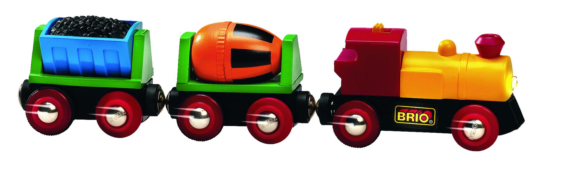 Batteridrivet tågset. Kolvagnen vippar och cementvagnen snurrar när batteriloket drar de båda vagnarna. Loket kräver 1 st AAA-batteri (25141), ingår ej. Av FSC-märkt bokträ och vattenbaserad färg. PVC-fri.Från 3 år.