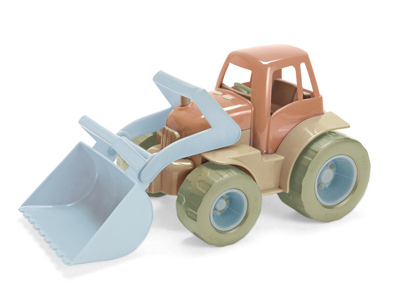 En unik traktor av bioplast som är baserad på sockerrör och är 100 % återvinningsbar. Traktorn har en höj- och sänkbar skopa fram. Tål frost. Livsmedelsgodkänd. Svanenmärkt, licensnummer 50950001. PVC-fri. Från 2 år.
