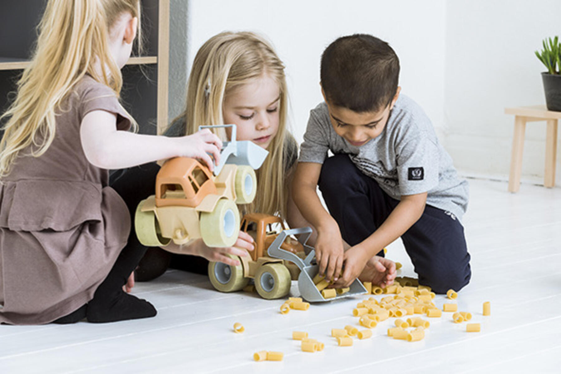 Traktor och lastbil som är helt baserade på sockerrör och 100 % återvinningsbara. Traktorn har en höj- och sänkbar skopa fram och lastbilen ett tippbart flak. Tål frost. Livsmedelsgodkänd. Svanenmärkt, licensnummer 50950001. PVC-fri. Från 2 år.