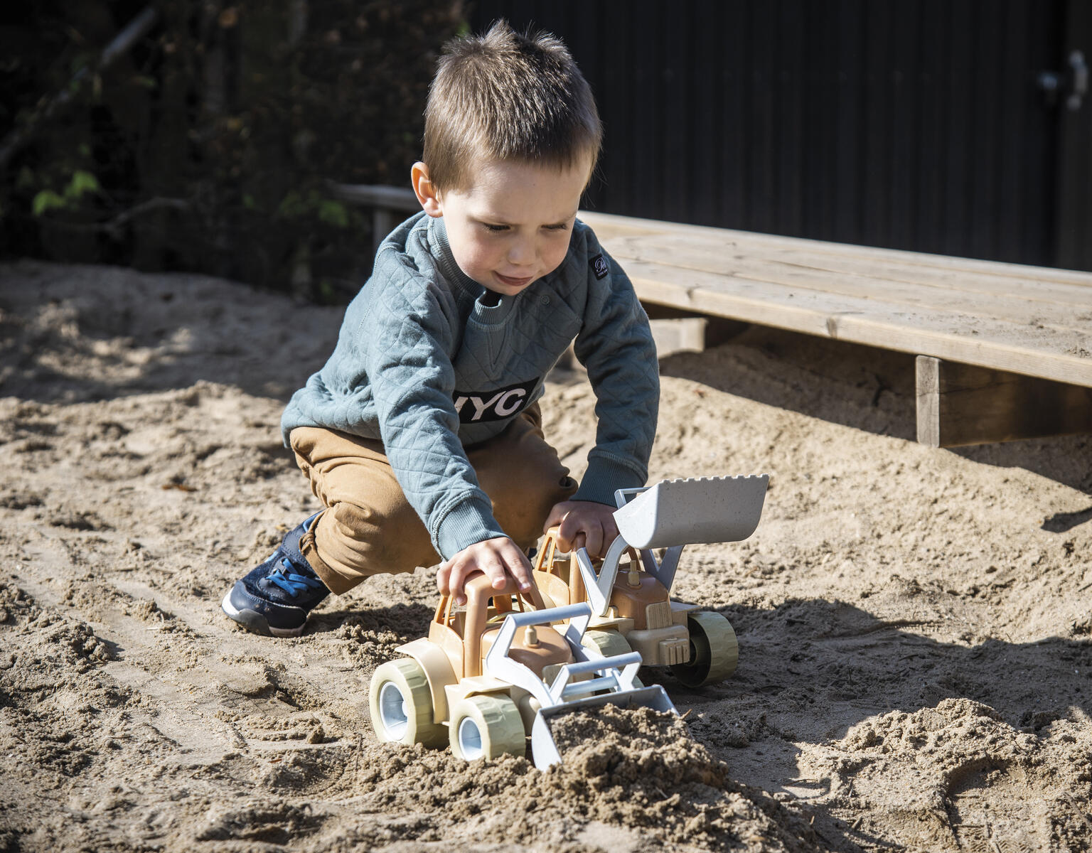 En rejäl traktor med kraftiga däck, där barnet kan sitta på det robusta traktortaket och själv lasta och lossa sand med hjälp av skopan. Mått: L58xB32xH33 cm. Av PP. PVC-fri. Från 2 år.
