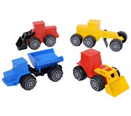 Fordonen kan användas för att leka ensam eller tillsammans med andra barn. Alla arbetsfordon är av starka och klara färger. Med hjälp av de rörliga delarna såsom tippbart lastflak och grävskopor på fordonen blir leken mer verklig. Mått: ca 15–55 cm. Av PE. PVC-fri. Från 2 år.