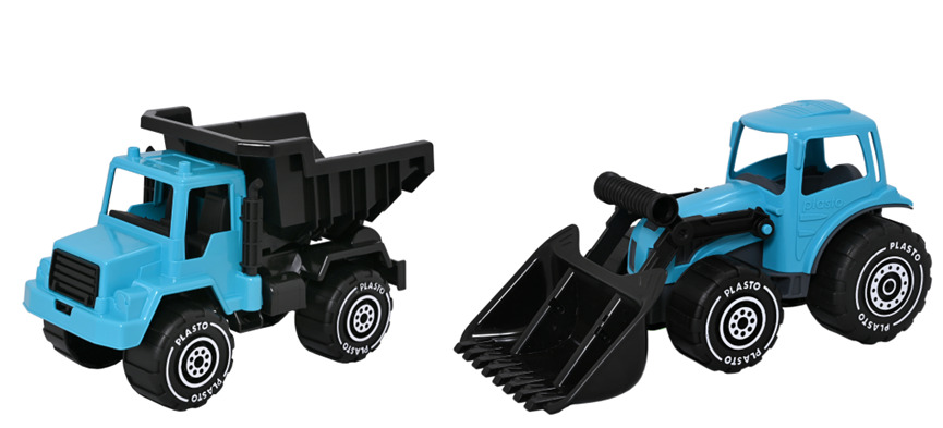 Setet innehåller en lastbil som är 20 cm lång av polyeten, en frontlastare som är 30 cm lång och en traktor med släp som är 42 cm lång av PE och PP. Svanenmärkt, licensnummer 50950001. PVC-fri. Från 2 år.