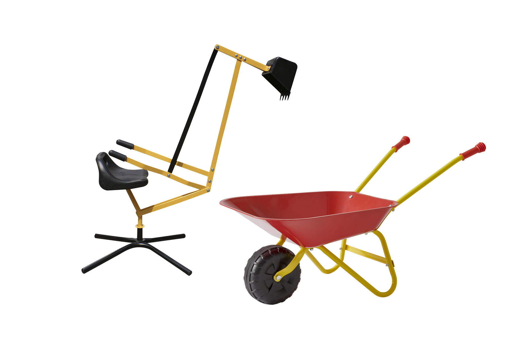 En rejäl och stabil grävskopa av stål. Smart konstruktion med hjul på ena sidan av plattan för att underlätta förflyttning. Enkel montering av två delar. Mått: stålramen är ca 70x45 cm och totallängden från ramens bakkant till skopan max utsträckt är 135 cm. PVC-fri. Från 4 år.