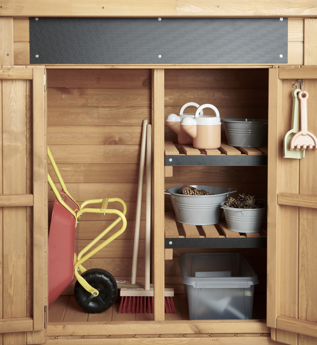 Detta skåp förenklar förvaringen i utemiljön för både barn och pedagoger. Skåpet kan fyllas med material i korgar eller backar och gör materialet mer lättillgängligt på gården. Skåpet är avdelat med 3 hyllplan på ena halvan och plats för stående förvaring som t.ex. innebandyklubbor eller käpphästar på andra halvan. Korgar eller backar ingår ej. Dörrarna är målade med griffelfärg så att barnen kan rita och dekorera. Dörrarna har en hasp på sidan för att kunna stå fullt utfällda under utevistelsen. Skåpet är förberett med ögla för hänglås (ingår ej). Lösning för förankring säljs separat, för väggförankring behövs 2 st av artnr 151133, eller för markförankring behövs 4 st av 151134. Skåpet levereras monterat, endast taket behöver skruvas på. Av FSC-certifierad furu.