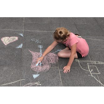 50 st/fp. Rita hopphagar, roliga gubbar och annat fint på asfalten. Tvättas enkelt bort med vatten. Innehåller 50 st kritor i mixade färger. Levereras i praktisk förvaringshink med lock. Längd per krita 10 cm. PVC-fri. Från 3 år.