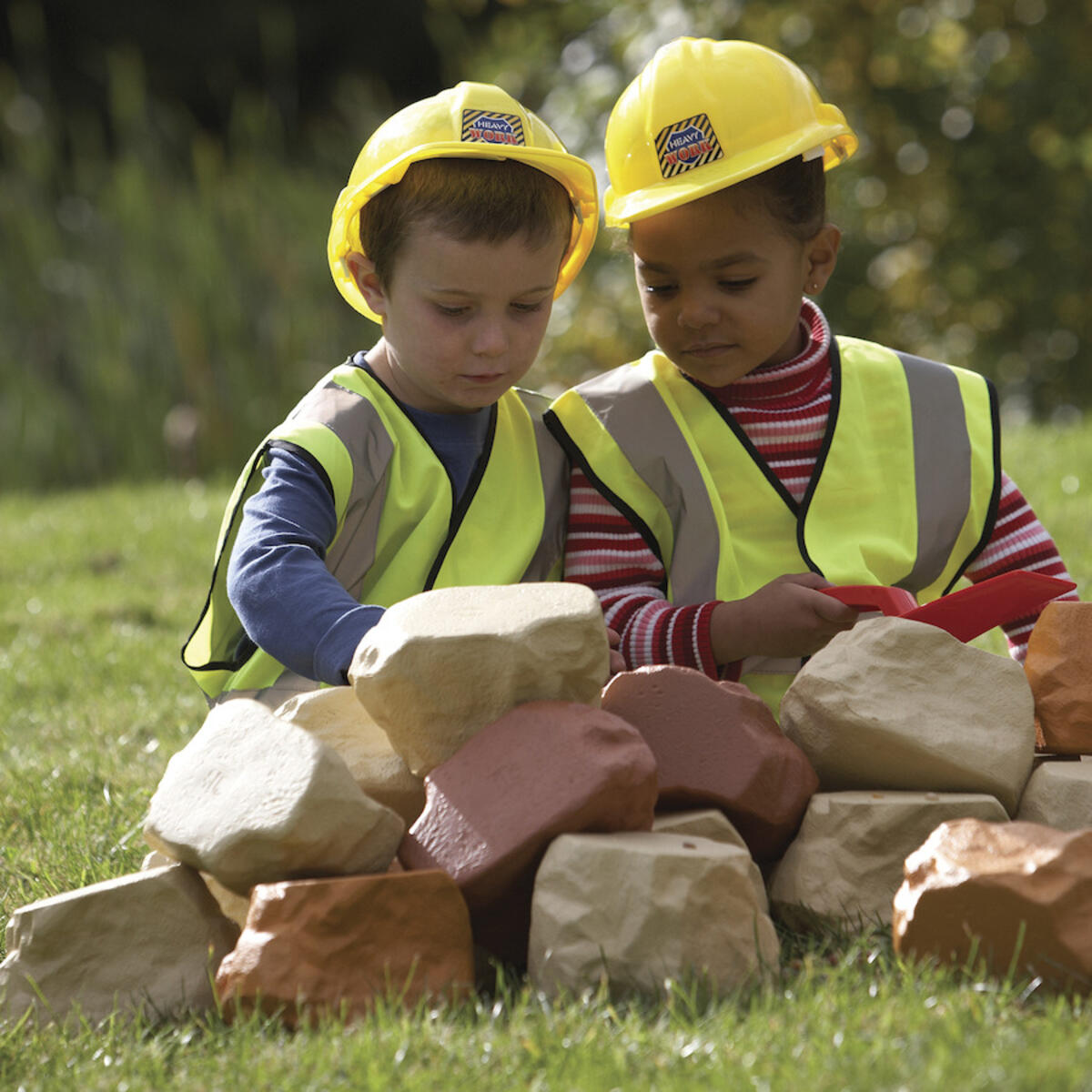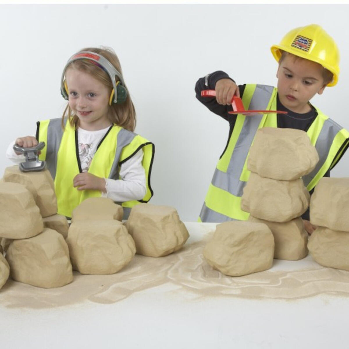 25 st/fp. Realistiska låtsasstenar att stapla och bygga med. Perfekta för rollspel inomhus eller ute, där små byggare kan använda våt sand som cement. Stenarna finns i 3 olika färger med måtten: 12x18x15 cm. Av PU. Från 3 år.