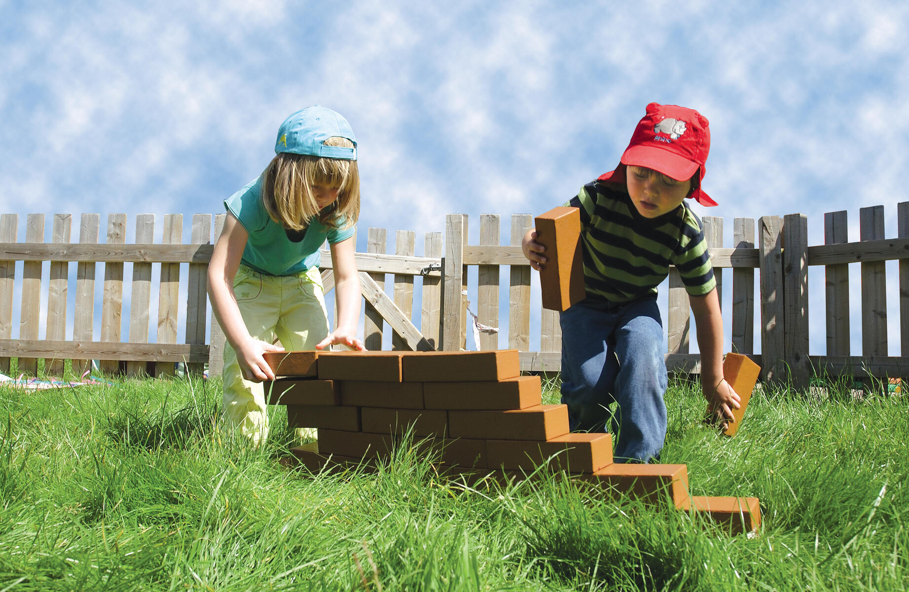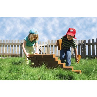 30 st/fp. Dessa klossar har samma storlek och färg som tegel. Låtsasteglet ger barnen en känsla av att vara riktiga små byggnadsarbetare. Mixa sand och vatten och använd t.ex. som "cement" mellan och i klossarnas hål. Klossarna är lätta, mjuka och tysta. Av plastbeklätt skummaterial. Passar både inomhus och utomhus, men bör förvaras inomhus. Av polyuretan. PVC-fri. Från 3 år.