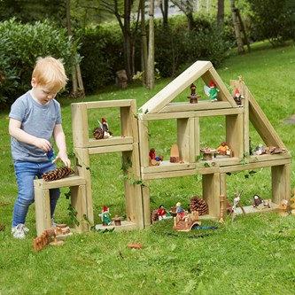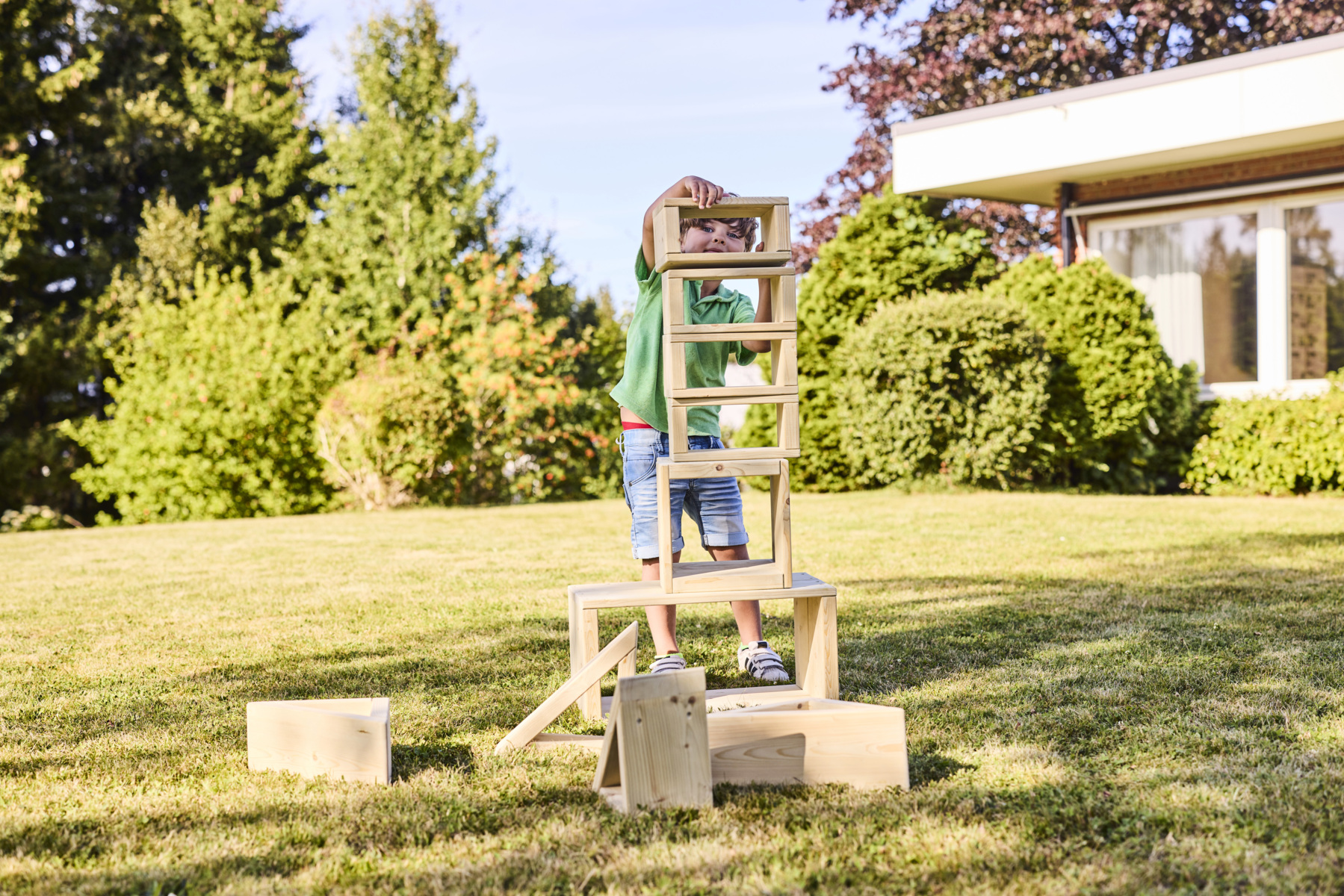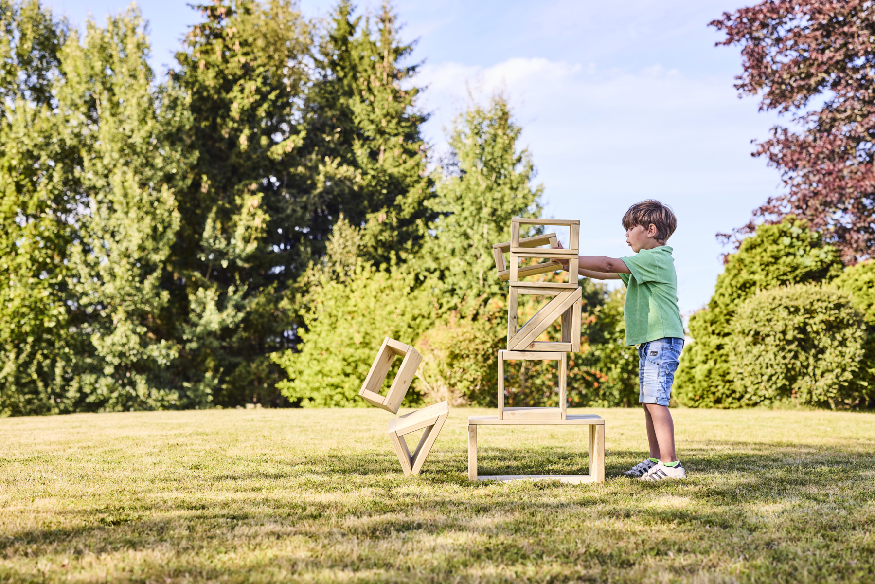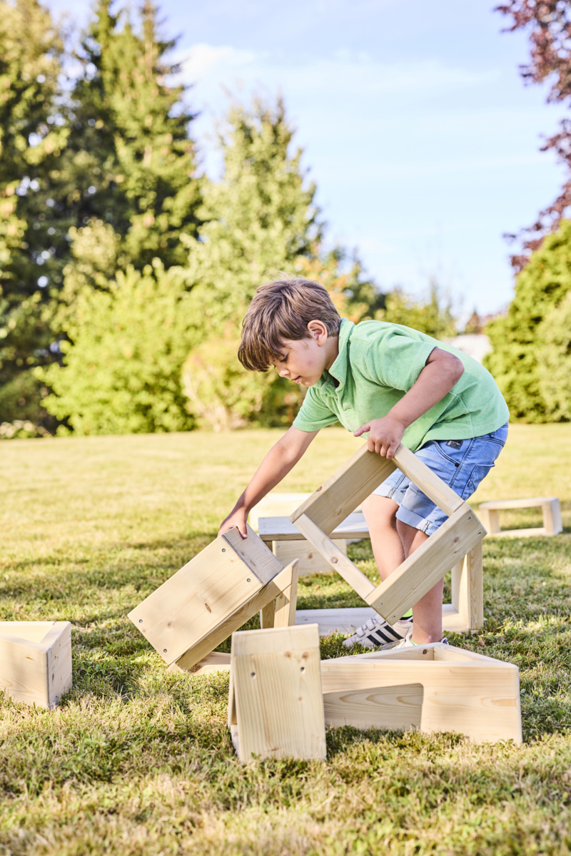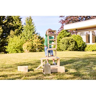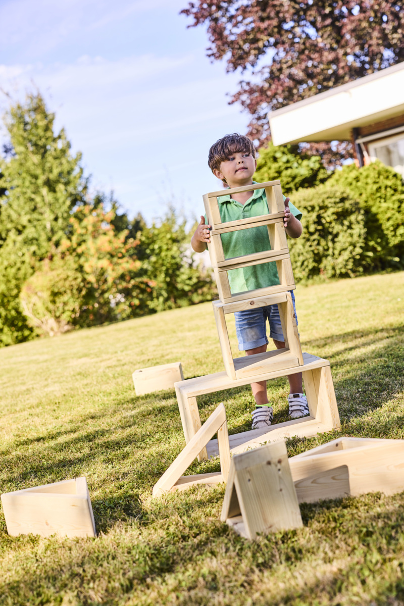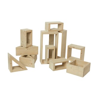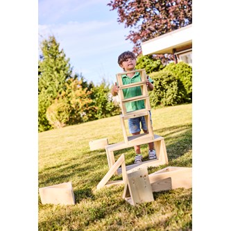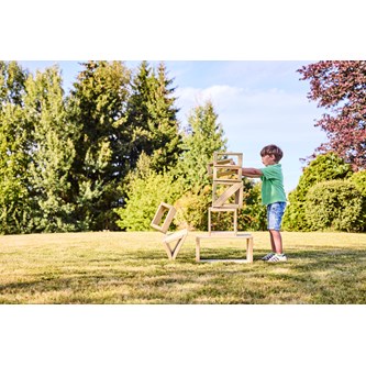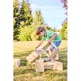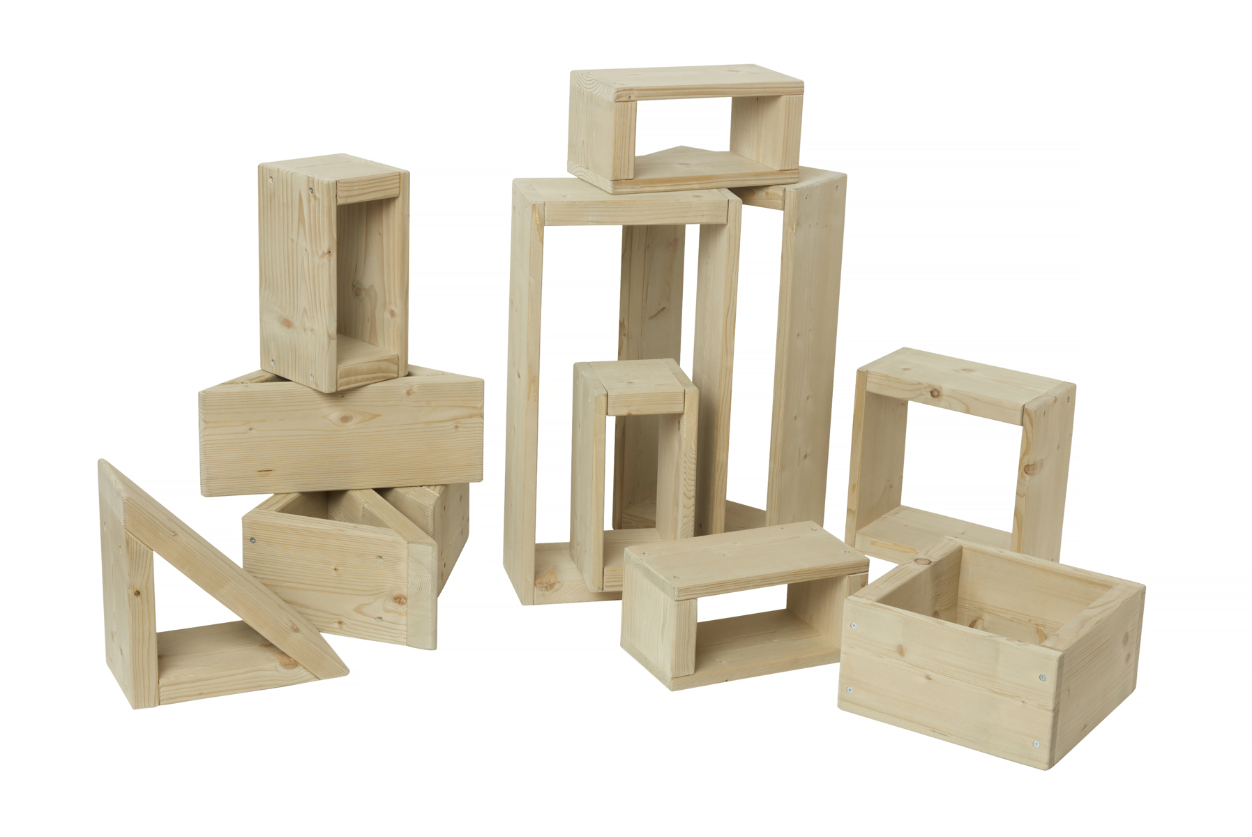9 st/fp. En uppsättning träklossar som kan förvandlas till olika öppna minimiljöer. Blocken kan placeras sida vid sida eller staplas för att bygga torn. Tillbehör ingår inte. Designade för att användas utomhus och tillverkade av förbehandlat skandinavisk furu. Måttexempel på största rektangeln: 45x30 cm. PVC-fri. Från 3 år.