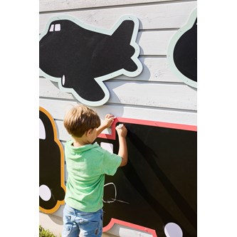 5 tavlor. Färgglada och vädertåliga svarta tavlor formade som fordon. Fäst dem mot stängsel eller staket och gör lekplatsen till ett roligt och spännande område att utforska. Innehåller 2 bilar, 2 flygplan och 1 lastbil. Mått lastbil: 85x96 cm. Buntband av plast som kan användas vid upphängning medföljer. Kritor köps separat, se artikel 46571. Från 3 år.