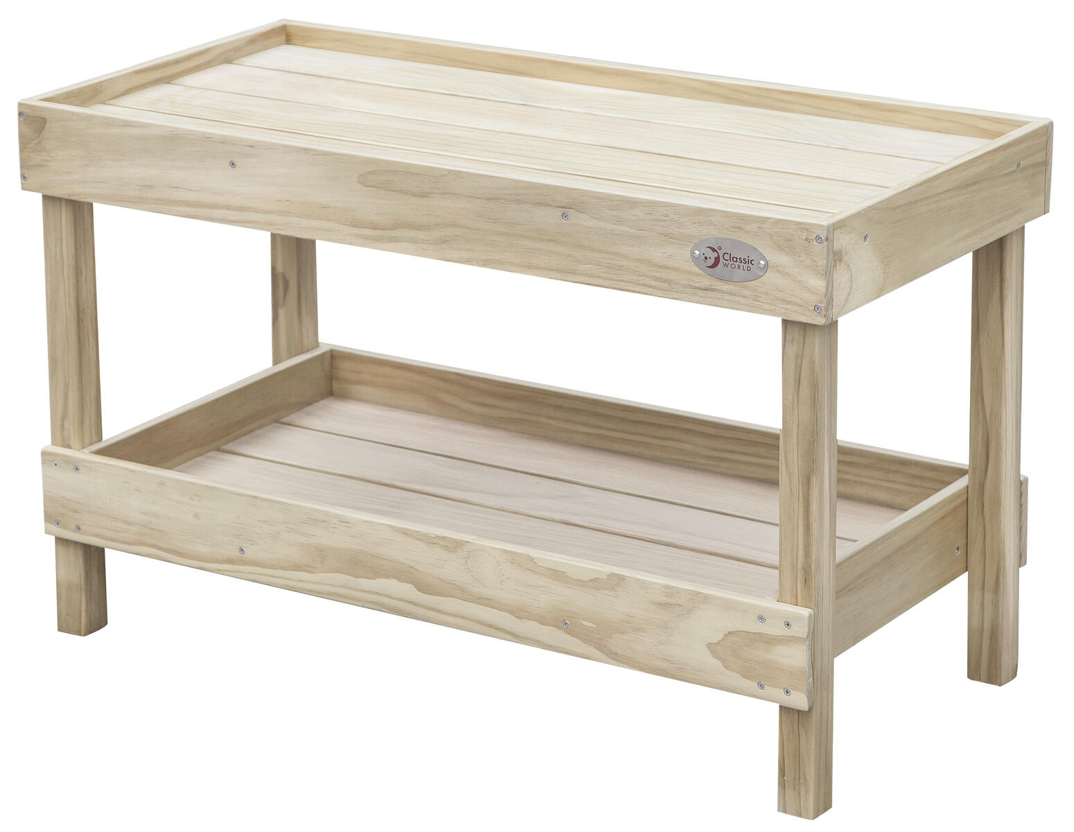 En robust köksbänk i två nivåer. Produkten har en rejäl ram av trä som är tillverkad av träskyddsbehandlad furu. Tillbehör ingår ej. Levereras omonterat. Mått: L43xB93xH57 cm. PVC-fri. Från 3 år. Ämnad för utomhusbruk.