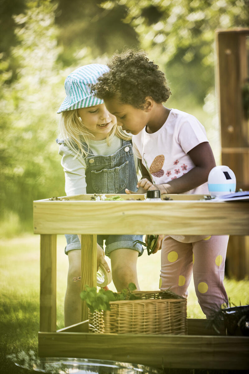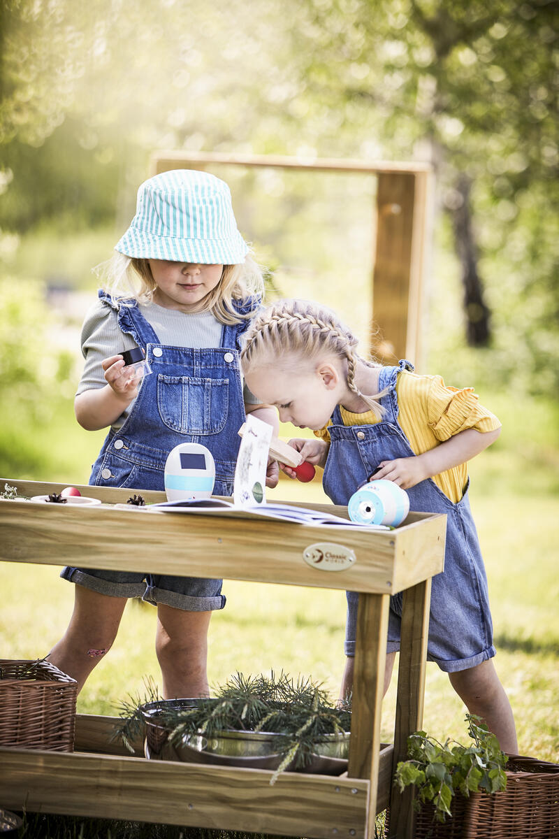Ett stabilt bord för utomhusbruk med 6 metallskålar av rostfritt stål som kan fyllas med alla typer av material, t.ex. lera och vatten. Man kan arbeta med matematiska begrepp, sortera eller väga. Lämpar sig utmärkt för lärande i grupp. En multifunktionell produkt som öppnar upp för ett fantasifullt sinne. Tillverkad av träskyddsbehandlad furu. Förvara helst på en sval, torr plats inomhus. Levereras omonterat. ø 90 cm. Höjd 60 cm. PVC-fri. Från 3 år. Ämnad för utomhusbruk.