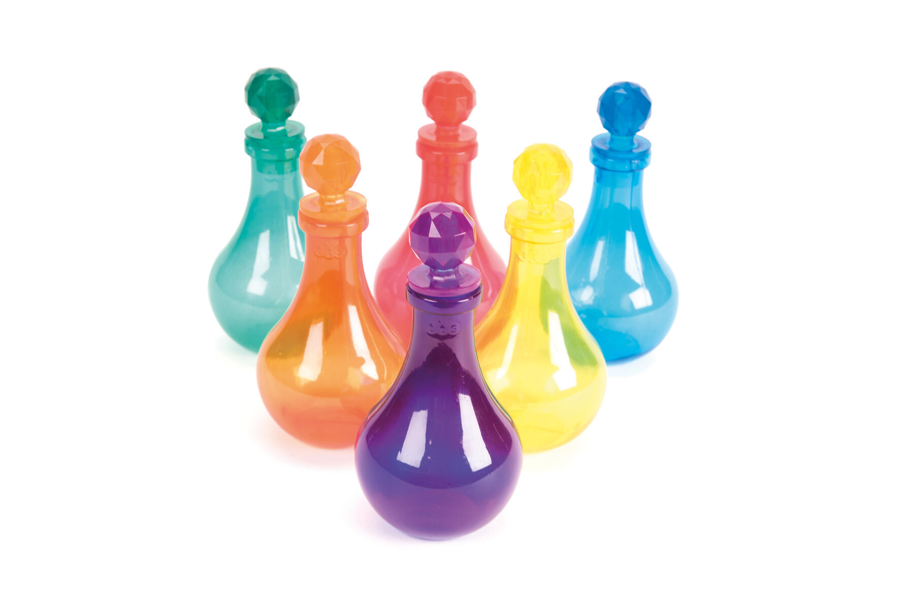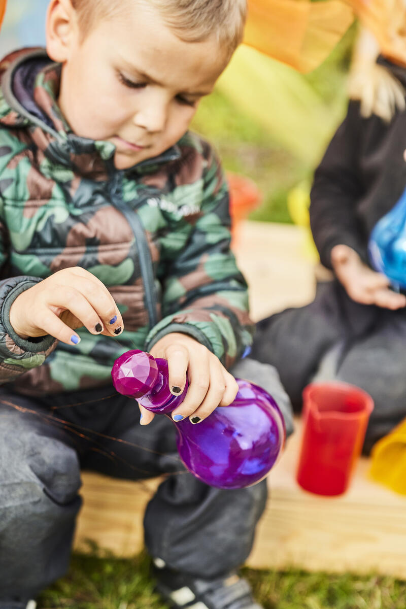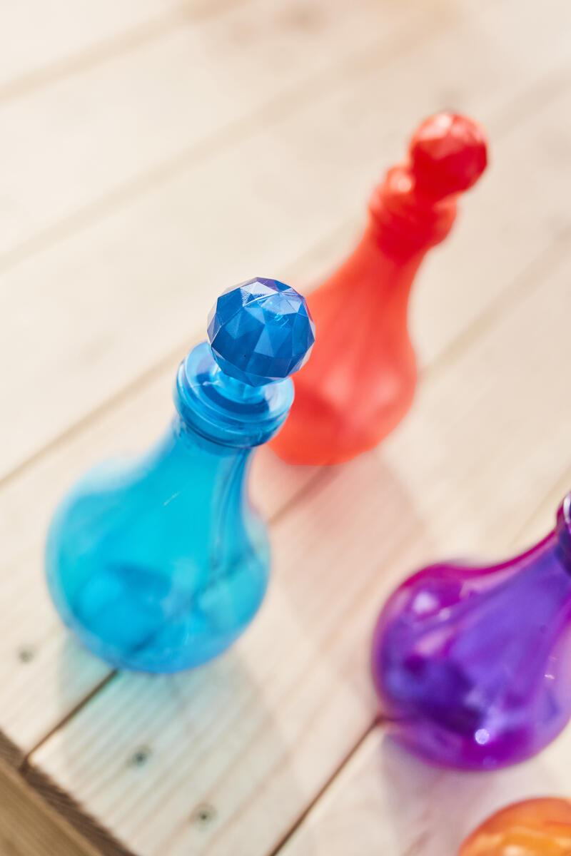 Vackra flaskor som stimulerar fantasin och upptäckarlusten. Fyll på, häll och blanda olika material såsom glitter, löv, stenar och vatten. Perfekt för sand-, vatten- och rollek både inne och ute. Av PVC, fri från ftalater. Från 10 månader.
