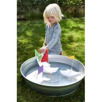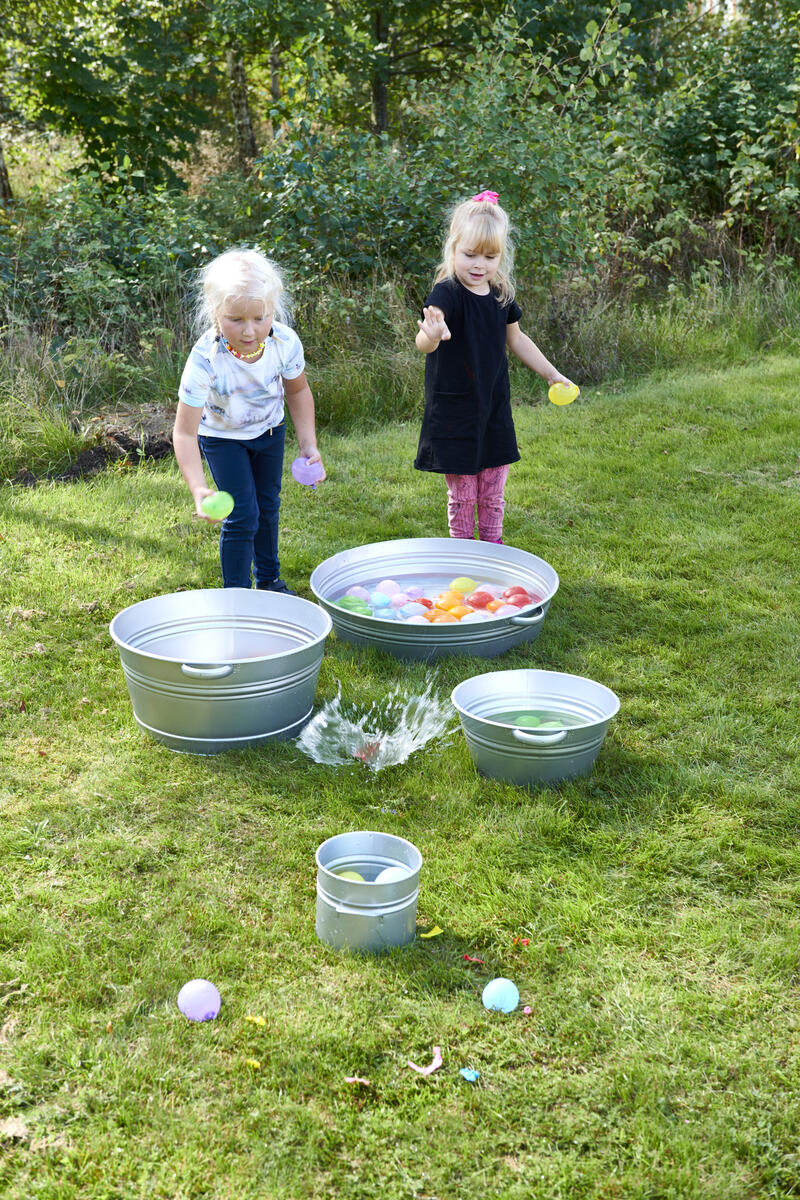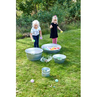 Praktiska baljor och kärl som enkelt kan placeras och flyttas runt i utemiljön. Används till att samla material, till rollekar eller till lek med vatten och lera. Innehåller 3 burkar i olika storlekar (den största: ø 18 cm) och 3 baljor i olika storlekar (den största: ø 26 cm). Tillverkade av galvaniserad metall. PVC-fri. Från 3 år.