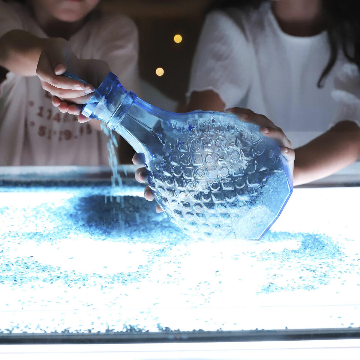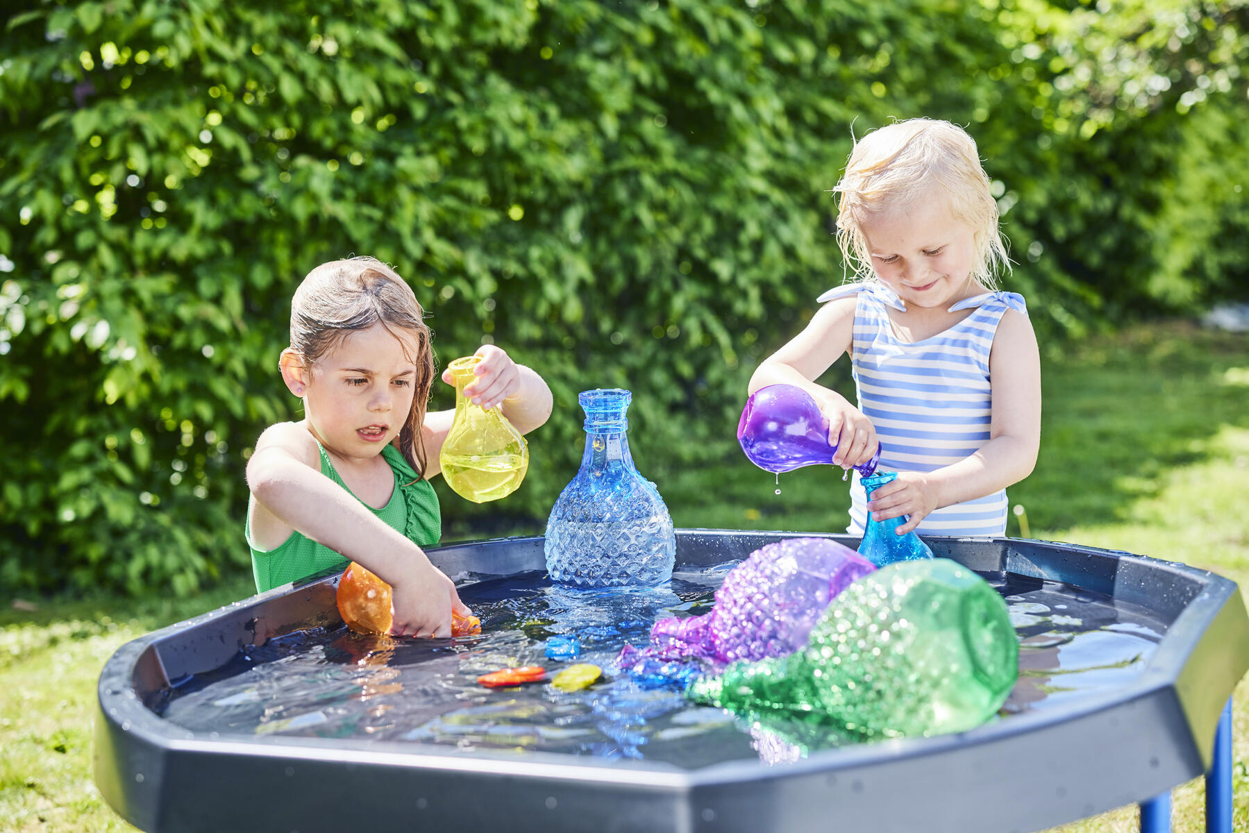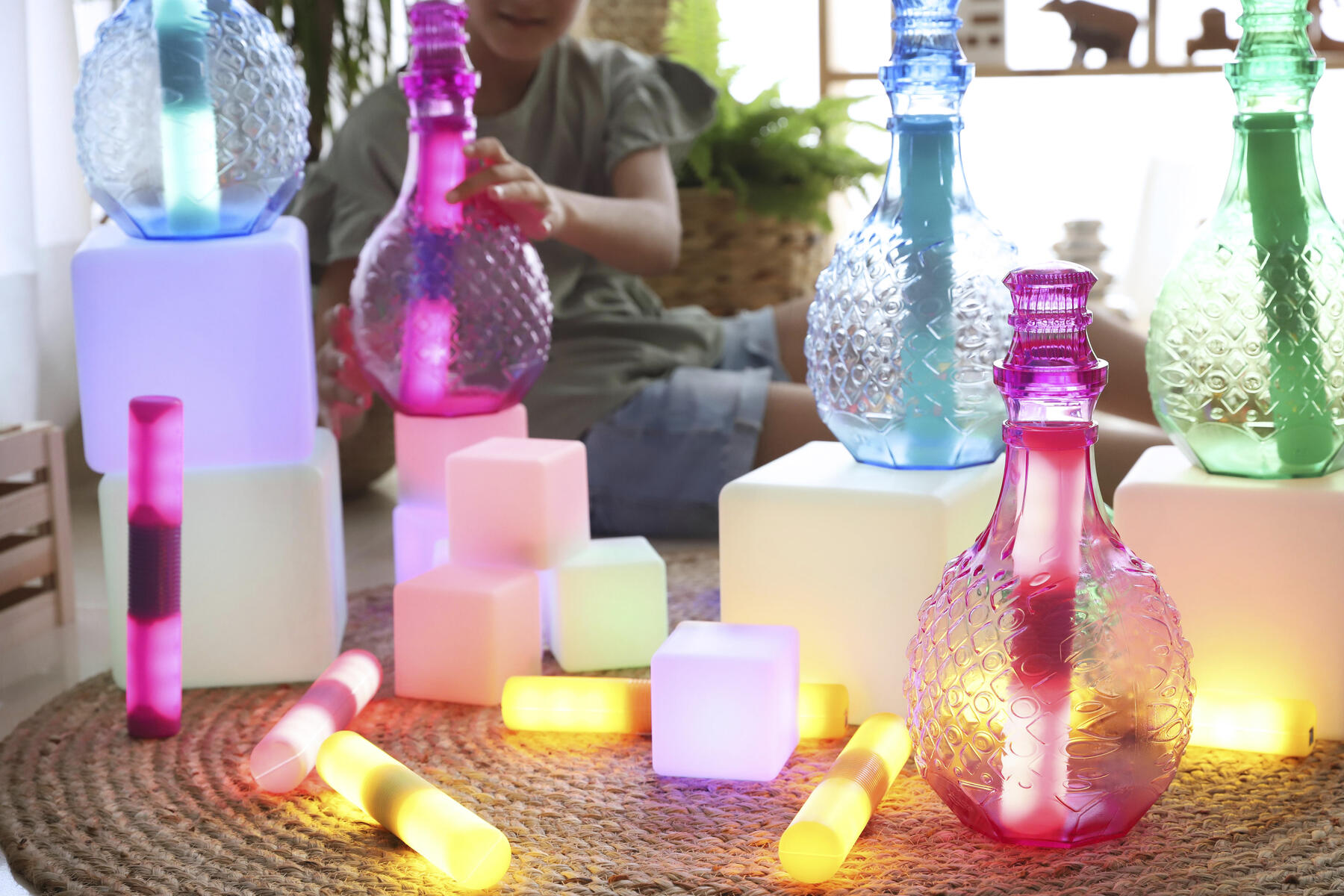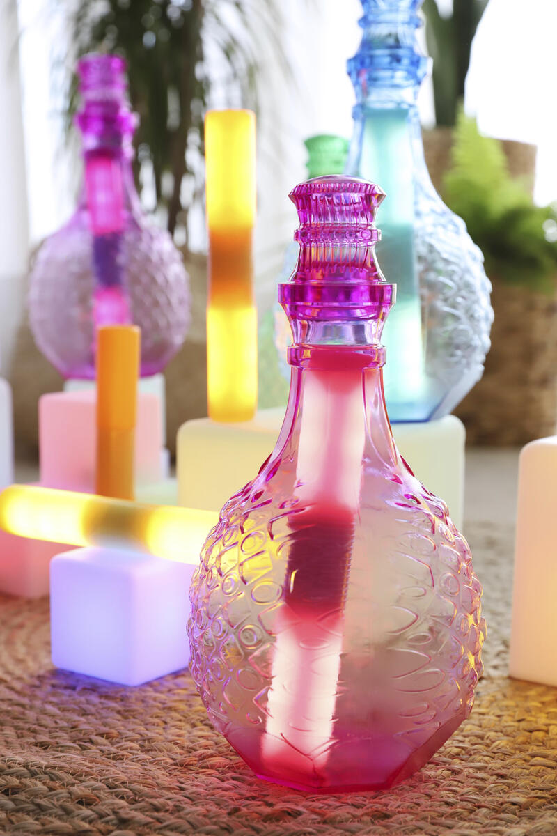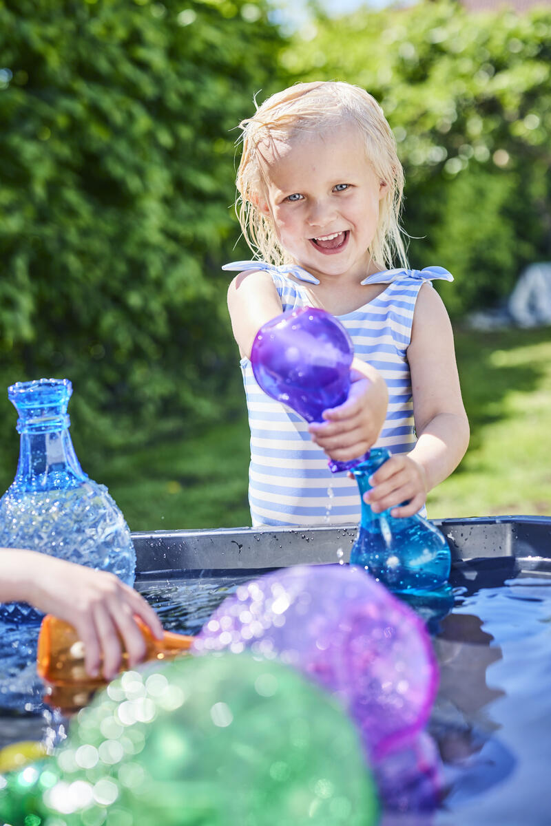 Vackra flaskor som stimulerar fantasin och upptäckarlusten. Fyll på, häll och blanda olika material såsom glitter, löv, stenar och vatten. Perfekt för sand-, vatten- och rollek både inne och ute. Av PVC, fri från ftalater. Från 10 månader.
