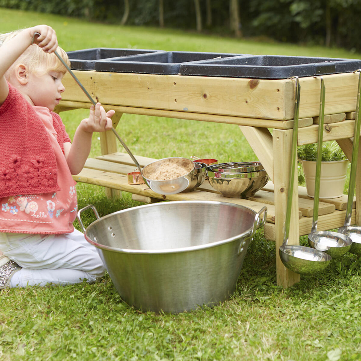 Ett roligt kök med egen vattenpump. Barnen utvecklar sin kommunikationsförmåga i verklig köksmiljö. Vatten fascinerar barn och denna produkt ger stora möjligheter till utomhuslärande. Pumpmekanism som är lätt att använda, plastbalja och kökstillbehör ingår. Tillverkad av träskyddsbehandlad furu. Levereras omonterat. Mått: L50xB69xH102 cm. PVC-fri. Från 3 år. Ämnad för utomhusbruk.