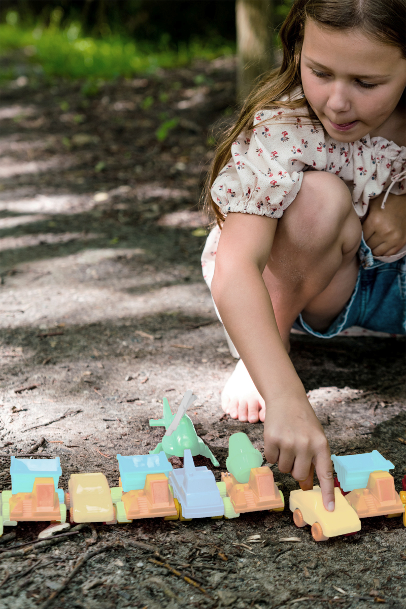 Innehåller blandade fordon i fina pastellfärger. Gummihjul för tystare lek av LDPE. Tillverkade av bioplast som är helt baserad på sockerrör och 100 % återvinningsbar. Levereras i transparent förvaringshink. Tål maskindisk. PVC-fri. Från 1 år.