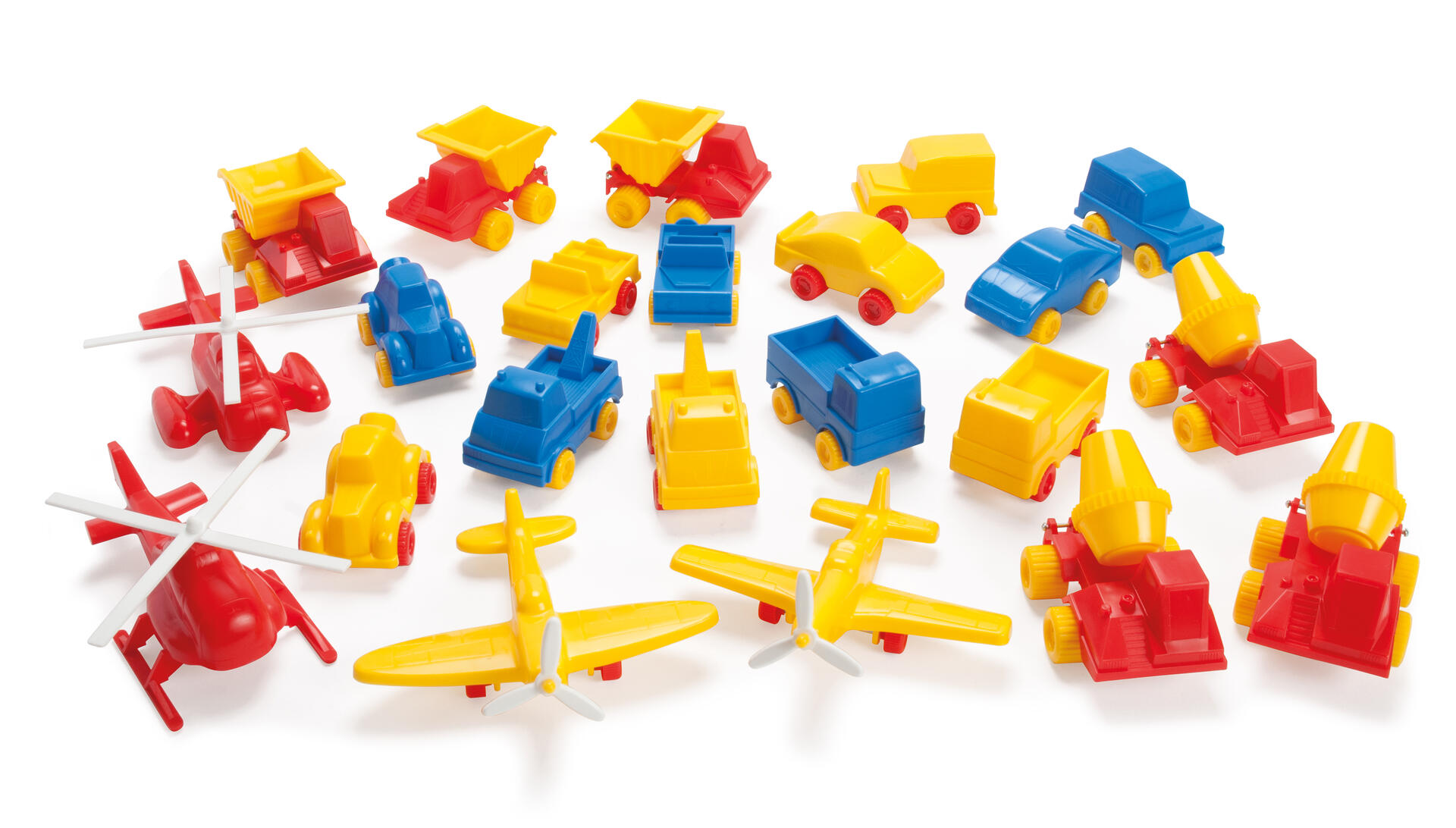22 delar. Bilar, lastbilar, flygplan och helikoptrar i Dantoys traditionella färger för lek både inomhus och utomhus. Svanen, licensnummer 50950001. Längd: 8,5-15 cm. PVC-fri. Från 3 år.