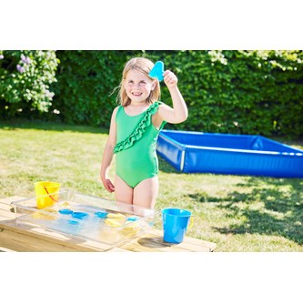 Innehåller hinkar, spadar, sandsåll, krattor, vattenkannor, sandhjul, byggbägare, sand- och vattenskopor samt sandformar i olika storlekar. Tål minusgrader. Av PP. Svanenmärkt, licensnummer 50950001. PVC-fri. Från 2 år.