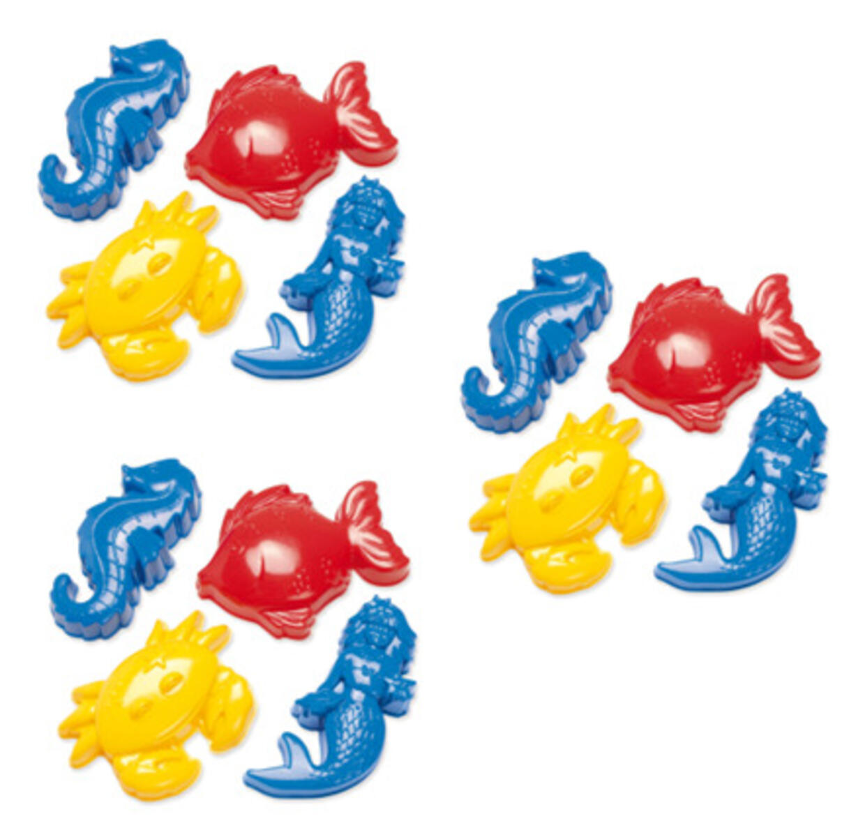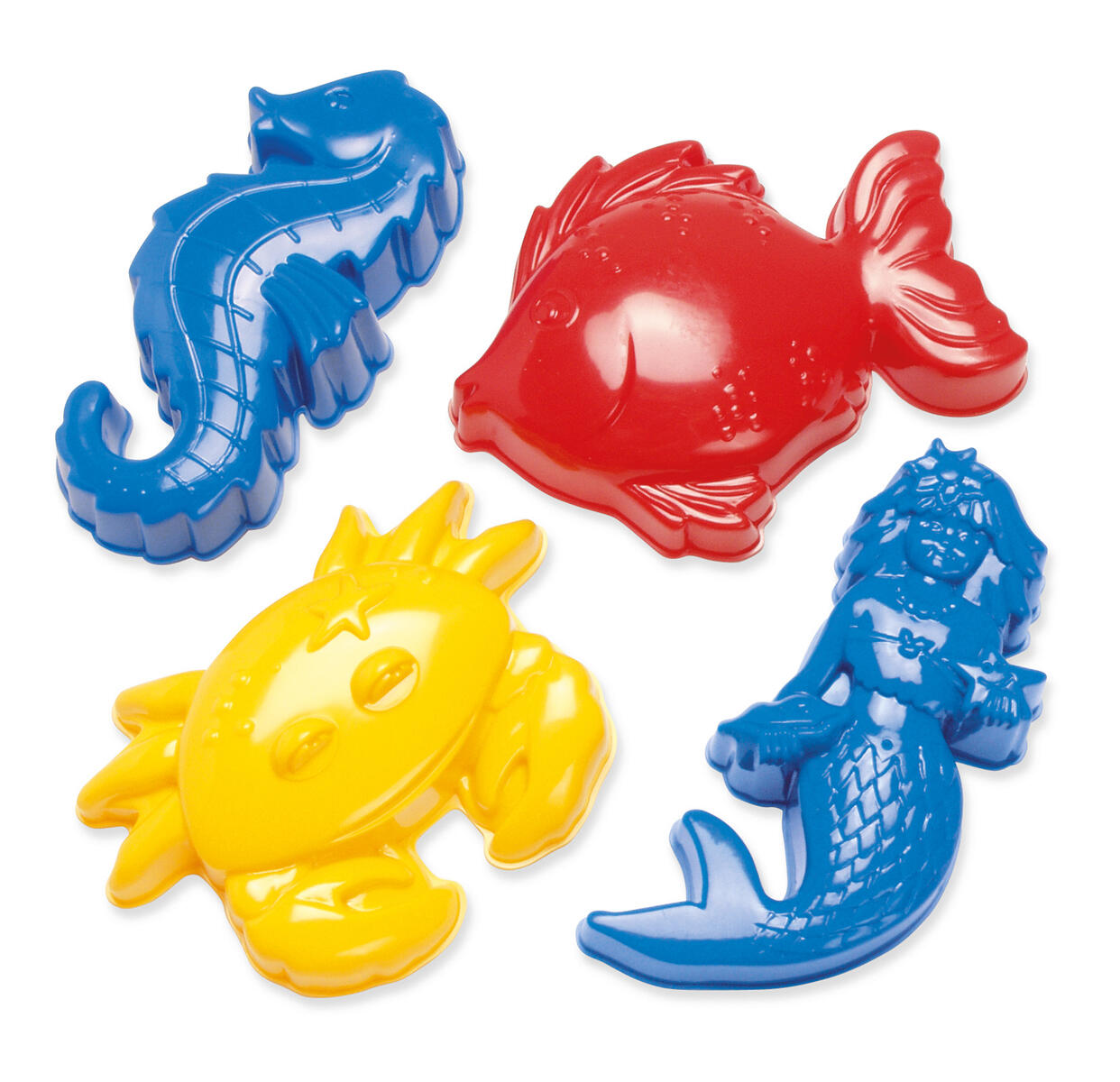 12 delar. Sandformar som liknar havsdjur i blandade färger. Levereras i nät. Längd 16 cm per styck. Av PE. Svanenmärkt, licensnummer 50950001. Från 2 år.