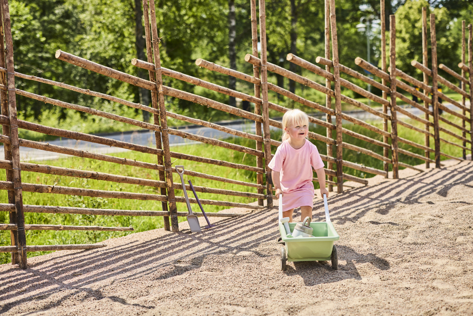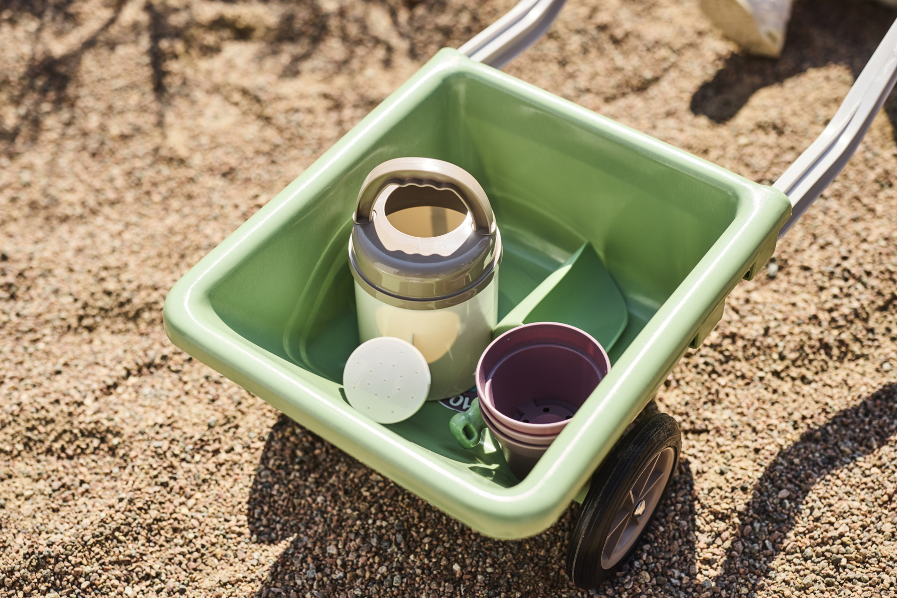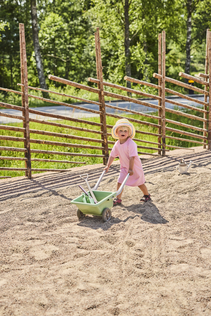 Innehåller hinkar, spadar, sandsåll, krattor, vattenkannor, sandhjul, byggbägare, sand- och vattenskopor samt sandformar i olika storlekar. Tål minusgrader. Av PP. Svanenmärkt, licensnummer 50950001. PVC-fri. Från 2 år.