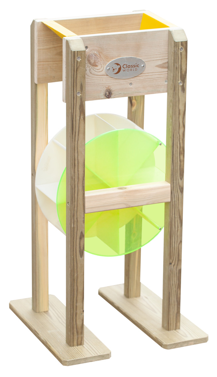 Häll vatten i trattarna och sätt snurr på hjulet. Tillverkat i träskyddsbehandlad furu med smidig uppsamling i botten. Mått: 38x44x65 cm. Från 3 år. Ämnad för utomhusbruk.